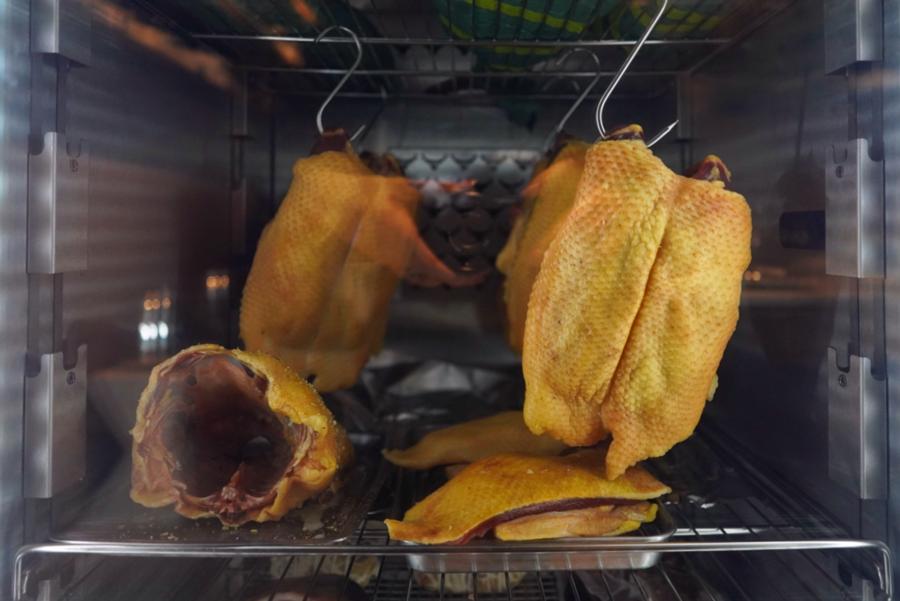 A masterclass in dry-aging, the Chicken & Duck (RMB258) is a frankenfeast of fowl. Lusciously fatty yellow Sanhuang chicken thigh is pressed with black truffle against Muscovy duck then dry-aged as one, before being seared, grilled, then seared again as a lasagna-like layering of poultry. Crisped chicken skin juxtaposes the succulent meat, smothered in a chicken jus and shansu leaf reduction.