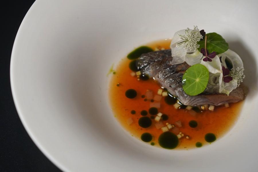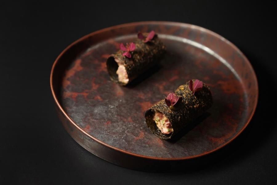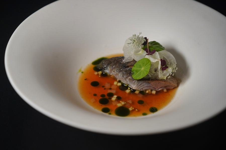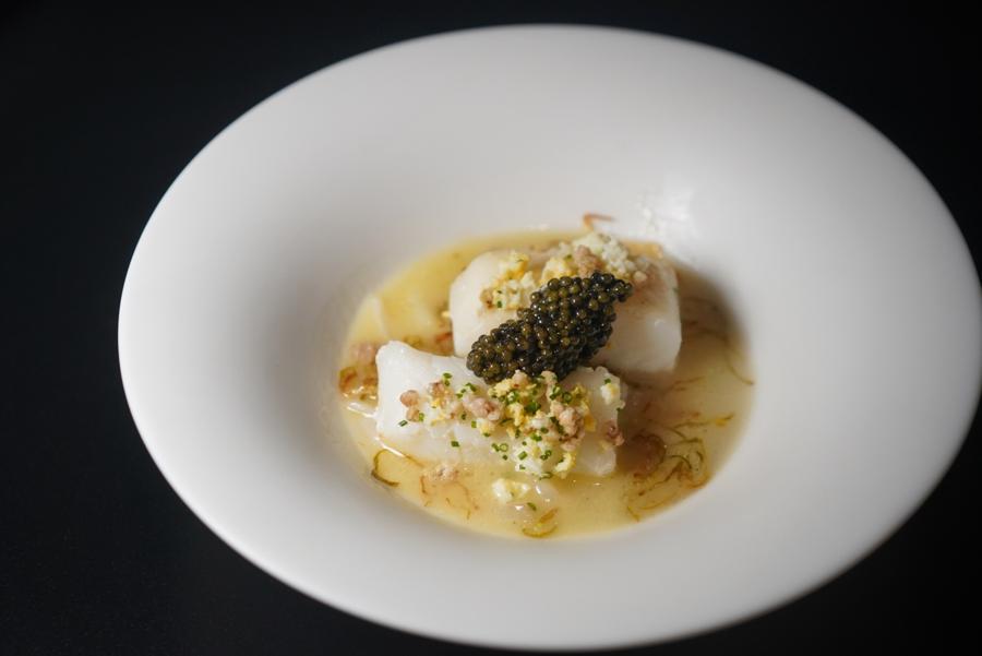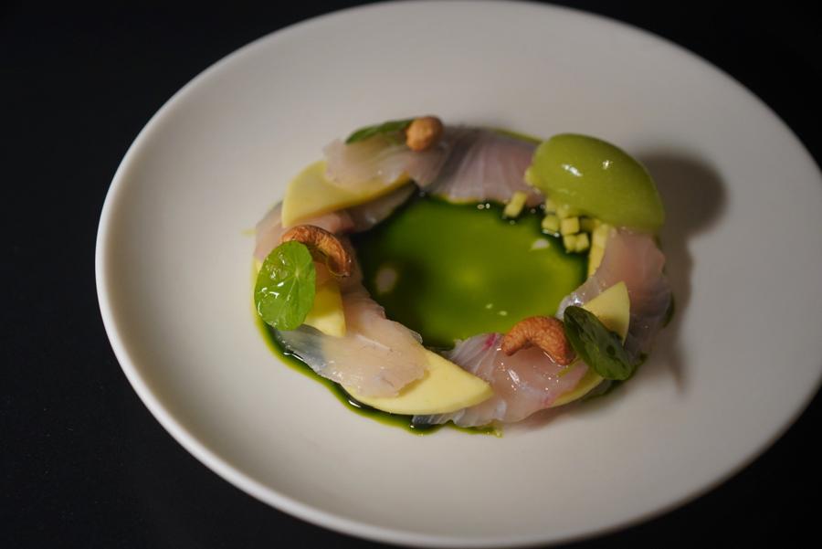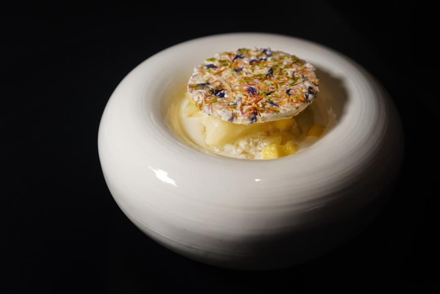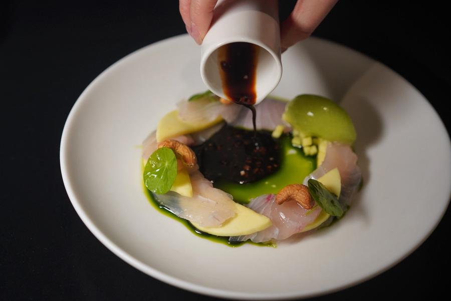 Equally clean in flavor, the Hiramasa & Wasabi (RMB188) offers a pleated, wreath-like arrangement of yellowtail amberjack and green mango. A quenelle of sweet wasabi sorbet provides a nose-tingling cold contrast, while creamy cucumber and coconut tiger’s milk is amped by nasturtium leaf oil. But the real kicker comes in the form of a homemade Chinese “dipping sauce” – a veritable trio of soy sauce, homemade aged vinegar, and chili oi. Clean, cold, and quietly complex, this is one not to be missed.