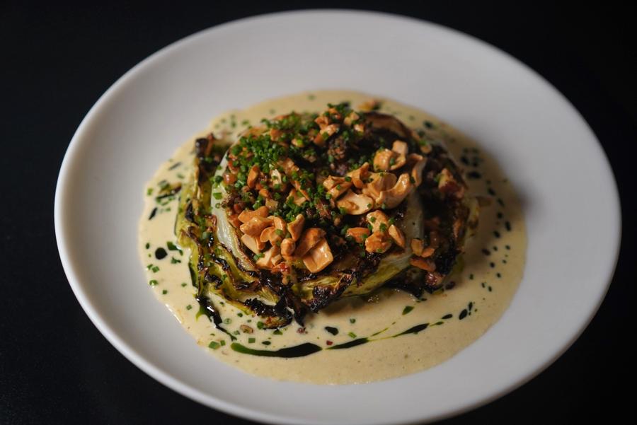 The Charred Hispi Cabbage (RMB78) transitions the palate from raw to warm, comforting bites, through frilly cabbage leaves, charred yet tender, encircled by a moat of mushroom cream sauce, anchovy emulsion, and caramelized cauliflower purée, dotted with verdant chive oil. A mélange of mixed nuts – toasted cashews, candied pecans, and crushed hazelnuts – adorns the top, the sprinkles atop a proverbial veggie “cake.”