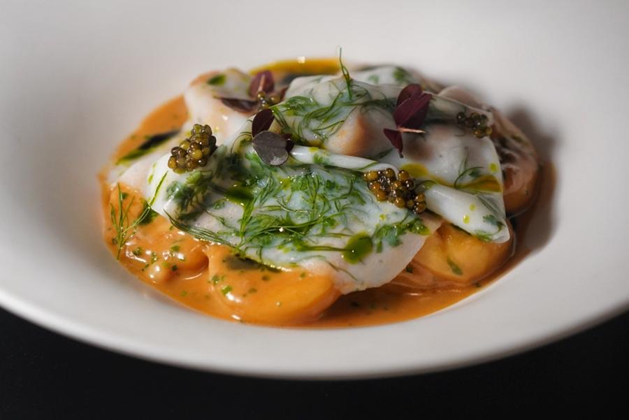 The humbly christened Gnocchi (RMB228) sees plush yet firm potato dumpling discs stuffed with both shrimp and beef tossed in an indulgently creamy shrimp bisque. Sheathed by a squid and fresh dill “cheong fun” (Cantonese steamed rice roll) whereby the squid’s bouncy flesh takes the place of rice batter, this spring-on-a-plate portion features crunchy water chestnuts, toasted walnuts, scallion oil, sorrel leaves, and fresh peas.