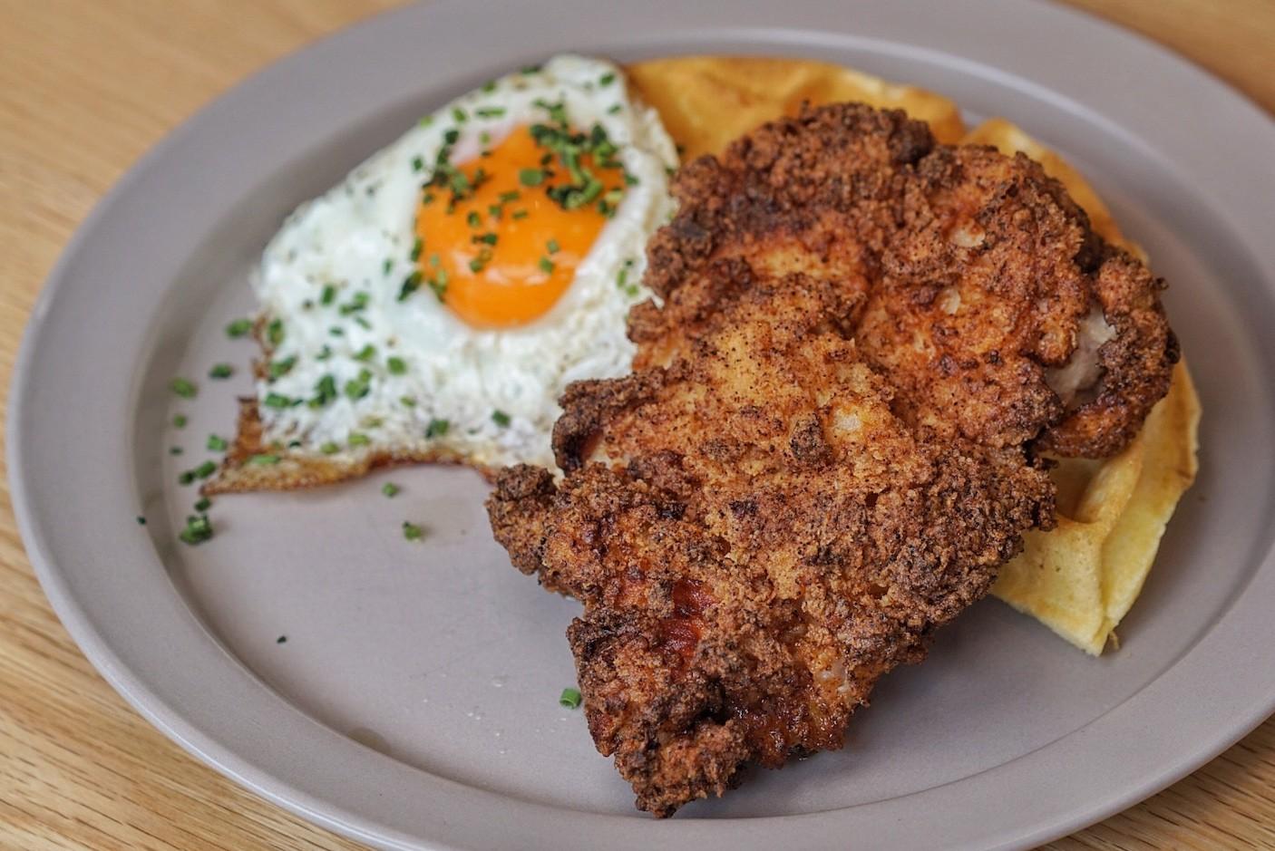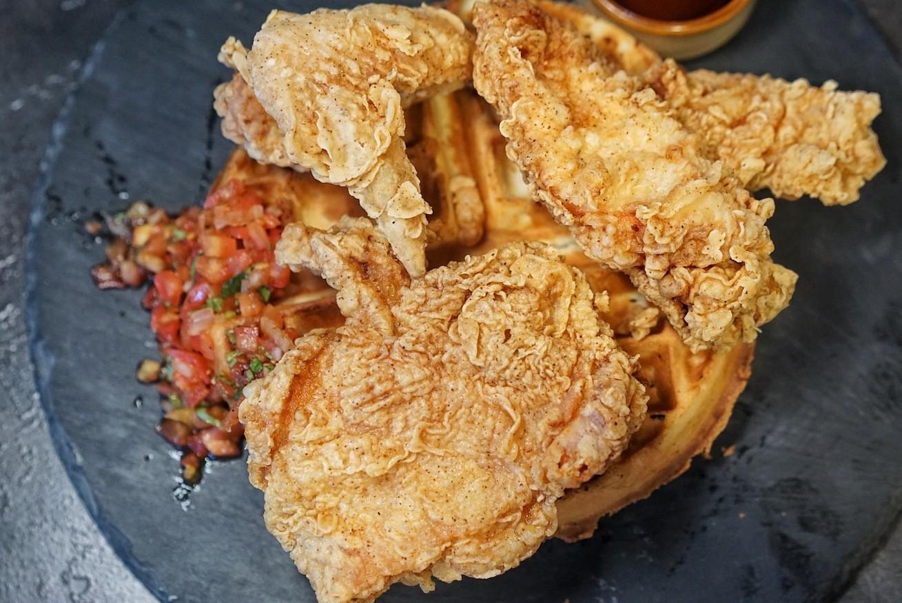 The boneless meat is first brined, then bathed in buttermilk, before being battered in a blend of flour, semolina, cumin and chili powder, among other spices. If you're really feeling the brunch spirit, you can also order your chicken and waffles as a stacked sandwich, where the waffle wedges become the bun, and an added layer of crunch is served in the form of crispy bacon.