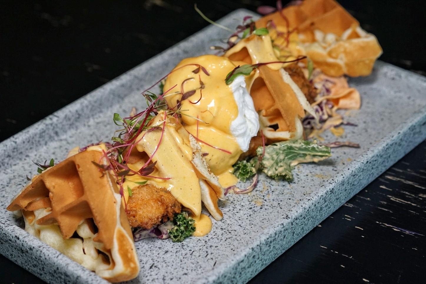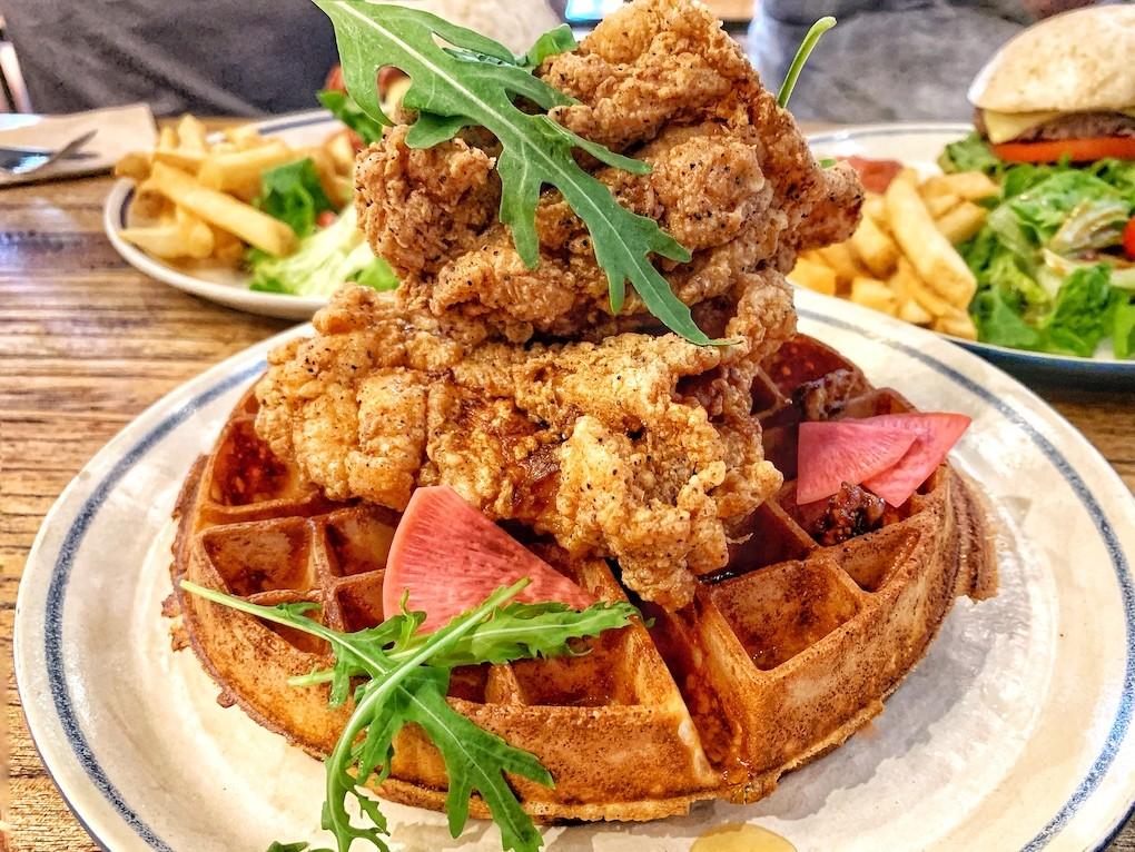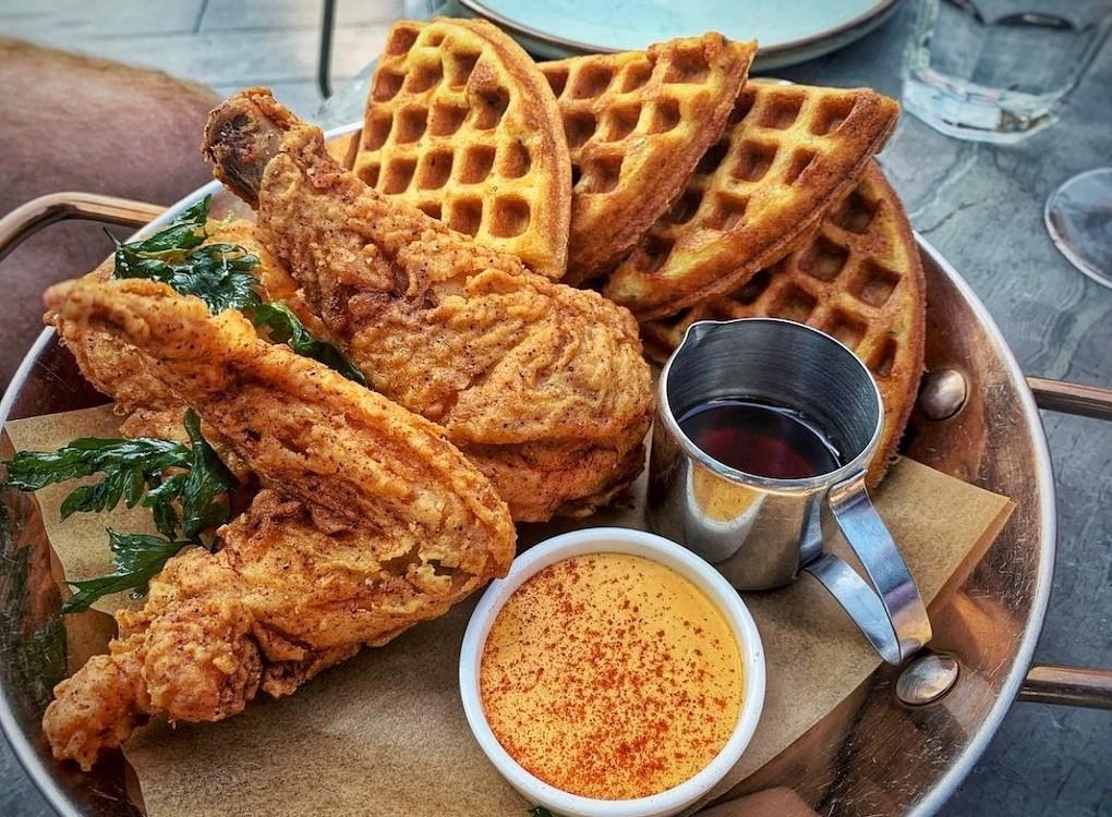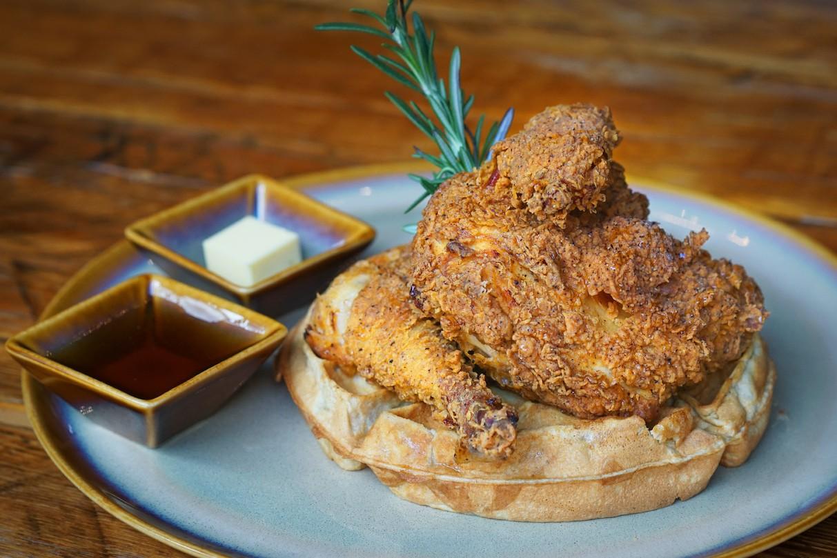 Simply put, chicken and waffles is a dish hailing from the USA that combines two things – you guessed it – chicken and waffles. Everything else is just bonus. Some believe chicken should only be served on the bone, while others hold their hat on the need for some form of spice. Maple syrup is a non-negotiable, yet the balance between crispness of the waffle and thickness of the batter is up for debate. Butter is always a plus.