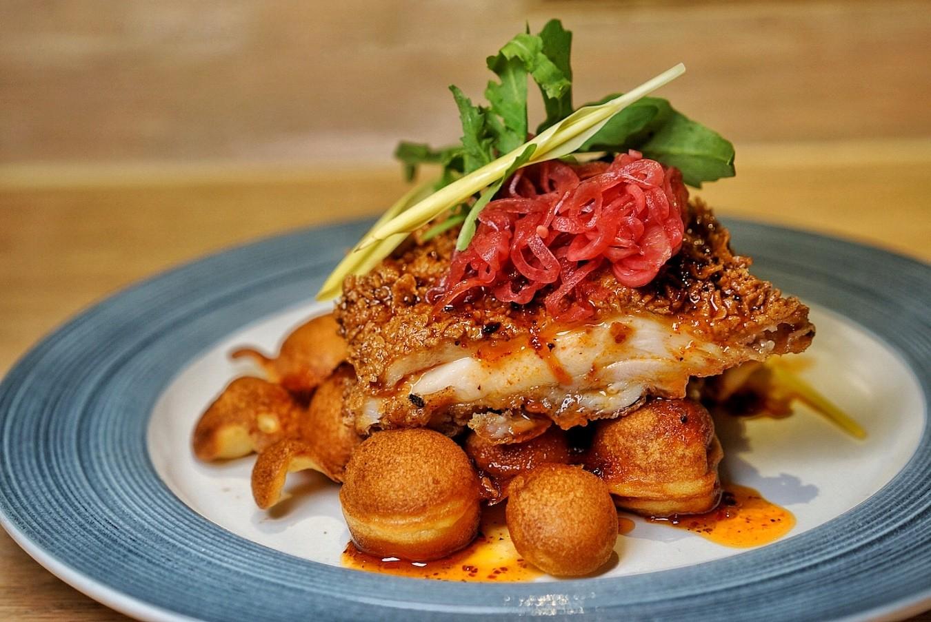 A fusion spin on Brut Eatery’s Chicken & Waffle sees six-spiced fried chicken stacked high atop a Belgian-style circular waffle. Pickled pink watermelon radish adds both color and tang, a vinegary hit to cut through fat-dripping fried chicken. Jujube honey – made with Chinese red dates – is liberally drizzled across the plate, while a sprinkling of candied walnuts adds more of that saccharine, earthy crunch.