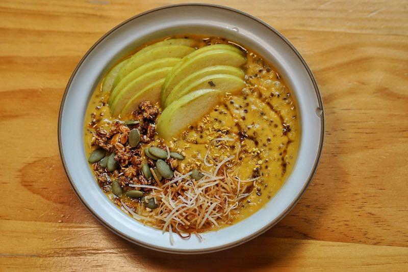 Egg’s Pumpkin Pie Porridge is what you want to curl up on the couch with while wearing fuzzy socks and a sweatshirt. From a base of roasted pumpkin, coconut milk, puffed quinoa and buckwheat to toppings like holiday spices, apple slices , miso-maple granola, pumpkin seeds, shredded coconut and maple syrup, this is a bowl of porridge Goldilocks would be all over.