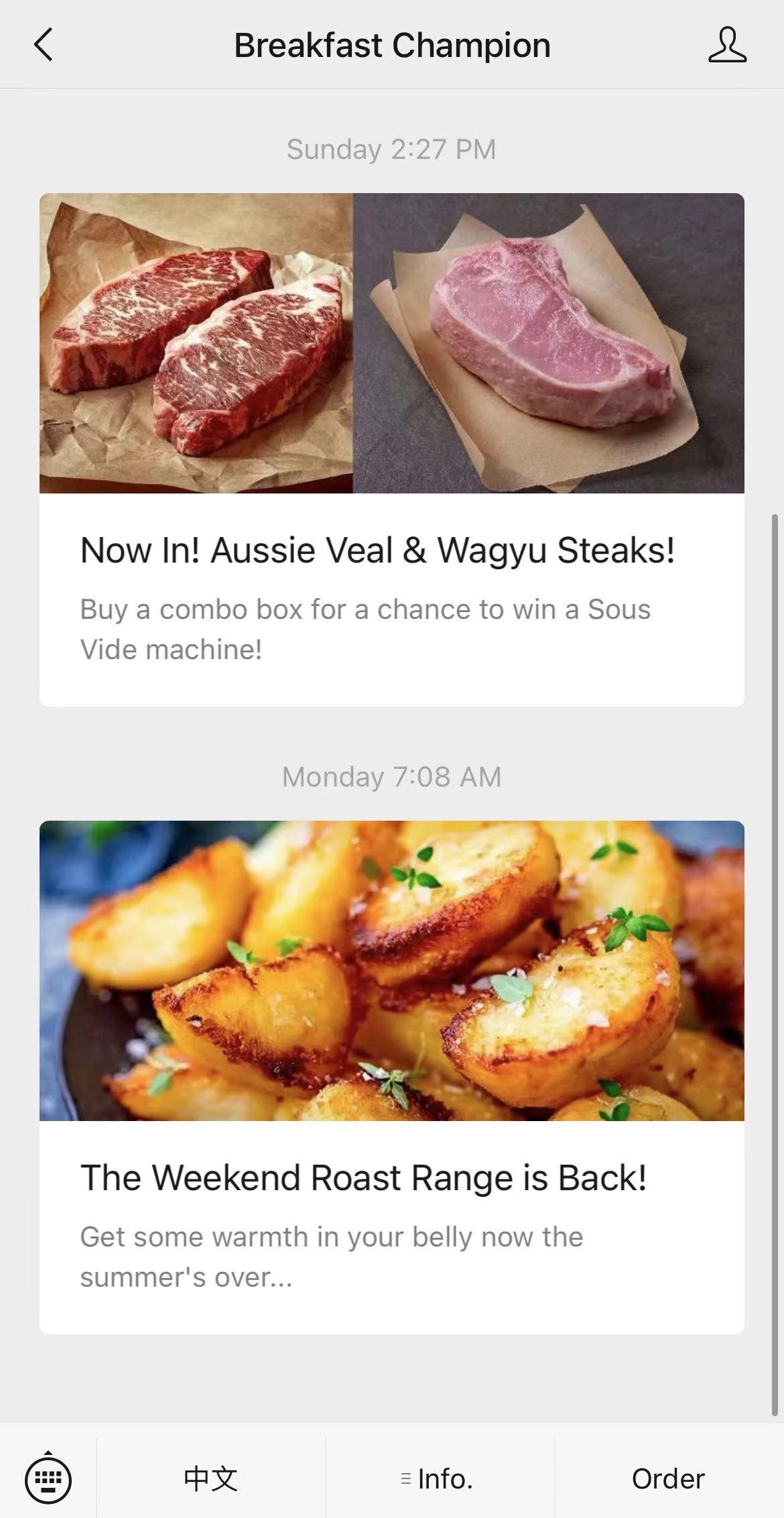 The online store is directly linked to the Breakfast Champion Official WeChat account. Follow their account by scanning the QR code at the end of the article, and enter the store by clicking the Order button.