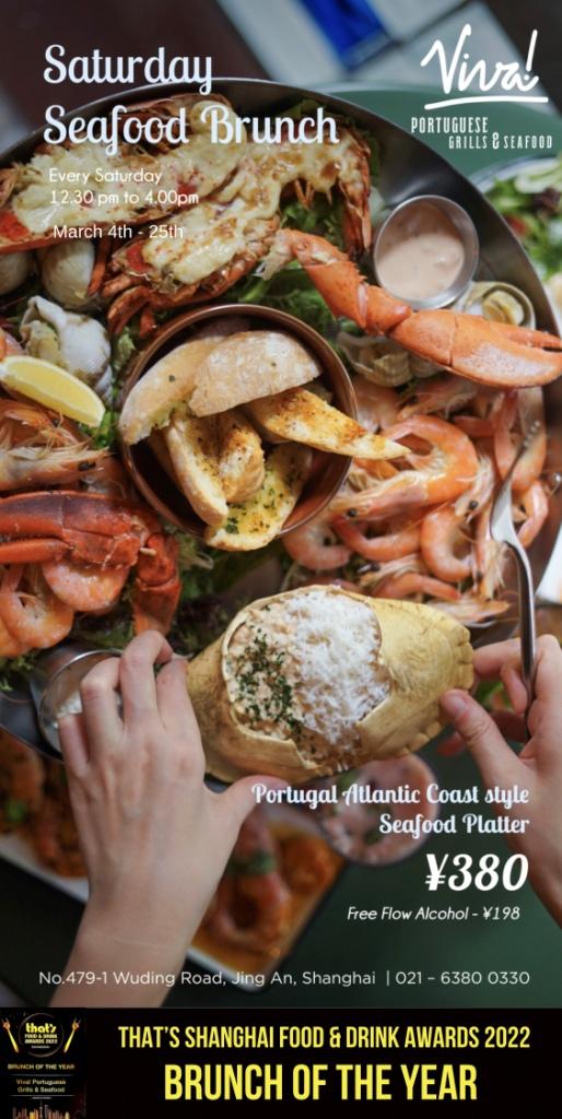 Brunch at Viva! is a lively affair, running from noon to 4pm on weekends. Saturday is all about the seafood with Prawns (RMB135/half kilo), Brown Crab Mousse (RMB120),and Portugal Atlantic Coast Style Seafood Platters (RMB380) on offer.