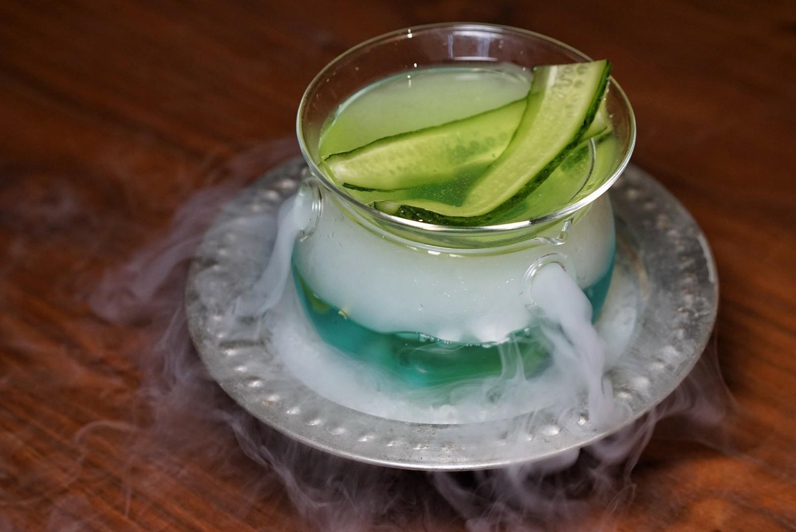 Cocktails are equally playful, with options like the Flower Language (RMB90), made with Bacardi, elder flower, rose fragrance, grapefruit syrup, jasmine and lime, and the Green Forest (RMB90), a smoking – literally – combination of vodka, cucumber syrup, melon liqueur, lime and bubbles poured over dry ice.