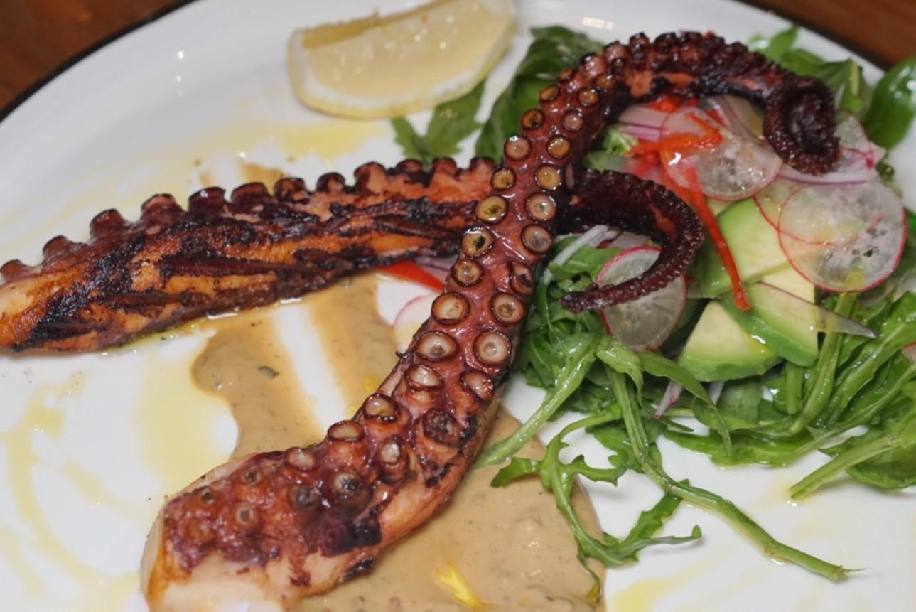 Two interlacing tentacles of the char-grilled Tasca Chino Octopus (RMB228) are seasoned with mala peppercorn, garlic and olive oil, resting on a slick dandan inspired sauce – shmeared with peanut butter and seasoned with cinnamon – beside a fresh avocado and radish green salad.