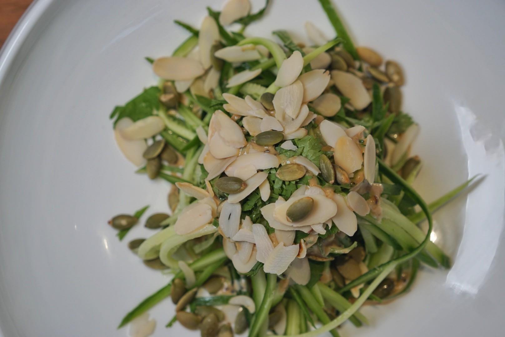 Starting with something refreshing – that sets the tone for the rest of the herb-filled meal – the Mekong Cucumber Salad (RMB98) is a stack of julienned baby cucumber and mint leaves, studded with almond slivers in a light olive oil and cracked pepper aioli.