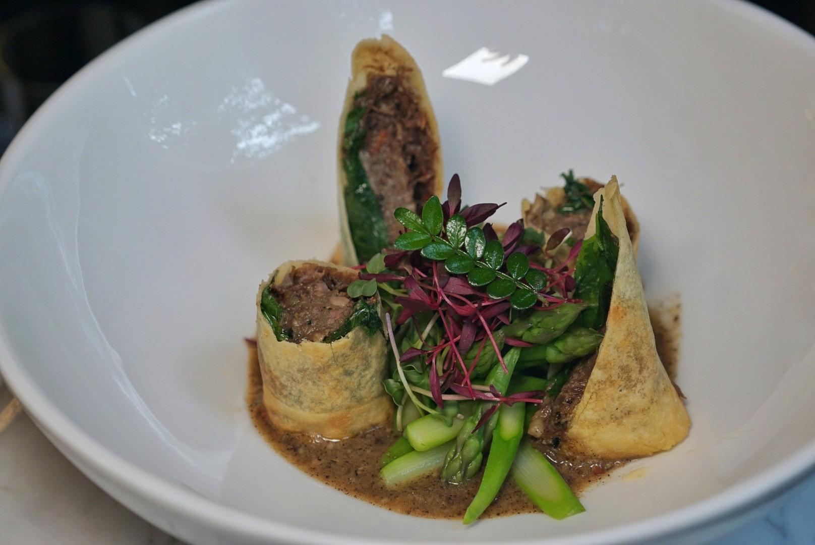 The meat is encircled by a crisp spring roll, then topped with confit onion, sweet from caramelization, and a hint of mung bean. The leftover stock is reduced down into a flavorful broth on which the spring rolls are served.
