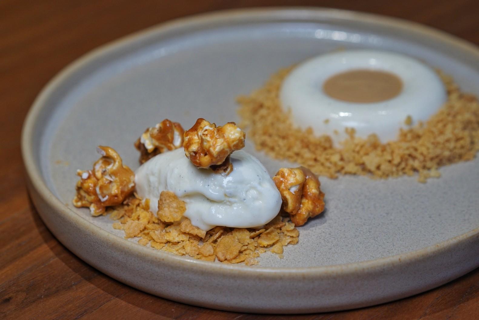 Corn is the focus of the Panna Cotta (RMB82) – served cold and ringing corn caramel, sprinkled with a corn crumble. A vanilla corn flake ice cream and caramel corn showcases even more of this versatile ingredient's pairing opportunities.