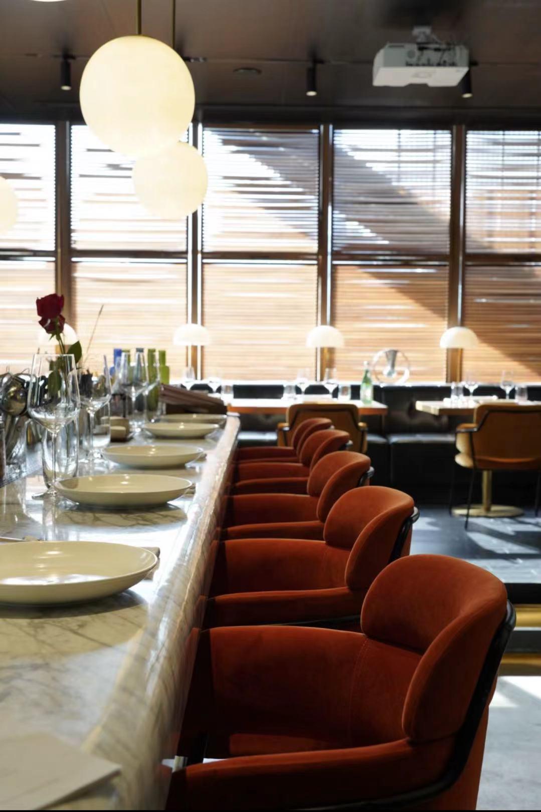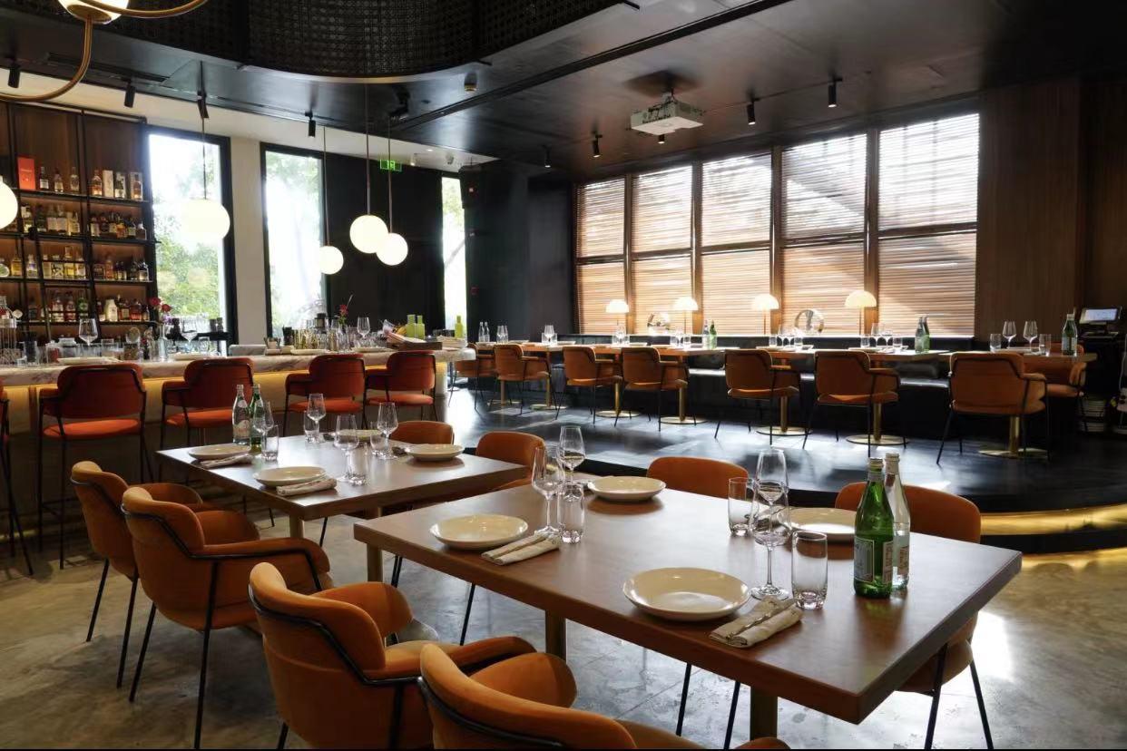The rest of the first floor is dominated by an open kitchen facing the main dining room, with a main bar area housing counter seating and a DJ booth.