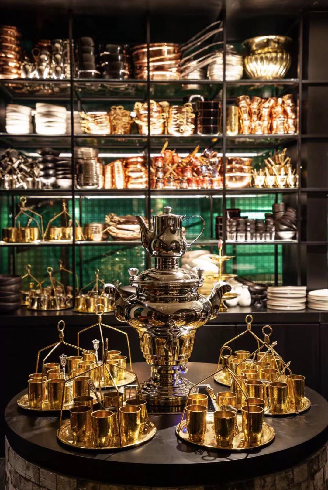 There is a double height connection to the second floor and Middle Eastern elements abound, like the engraved copper lanterns and tea sets.