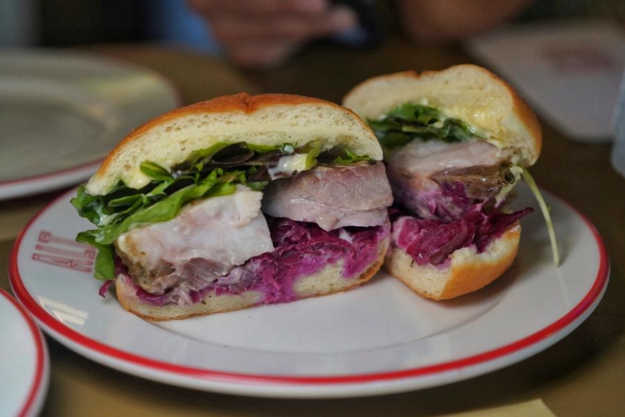 ALT's Bombolone Bun Sandwich (Melt-in-the-mouth pork, marinated red cabbage, mustard mayo, mixed greens)