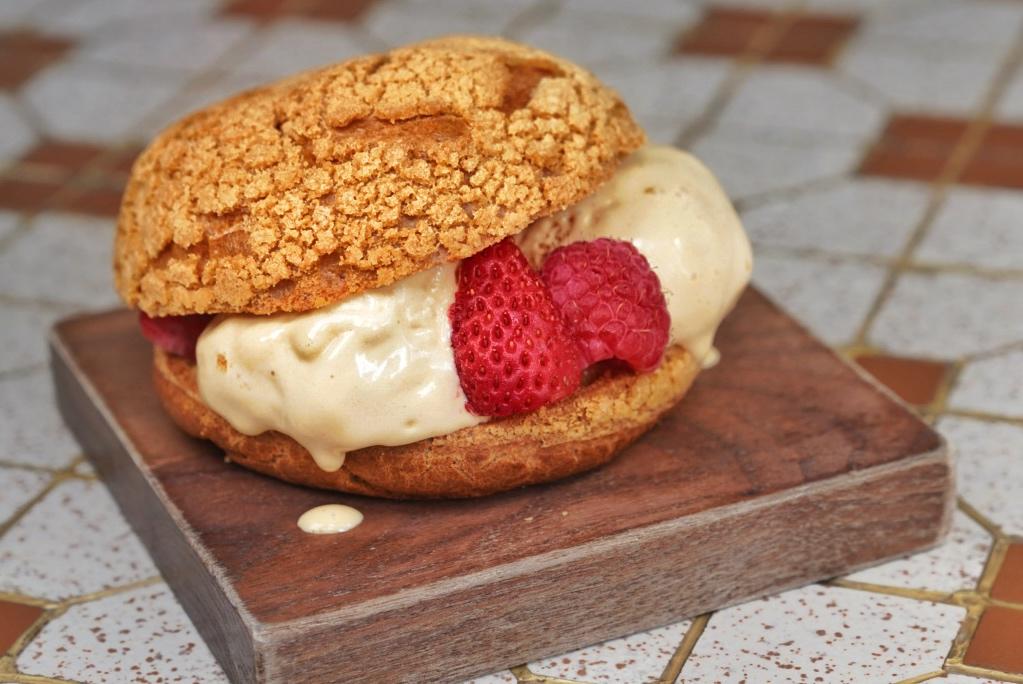 Pâte à choux is a classic French pastry dough used for everything from cream puffs to éclairs, but Zhu takes it a step further, adding a crumbled sugar crust, inspired by the Japanese melon bun, or a Hong Kong-style pineapple bun.