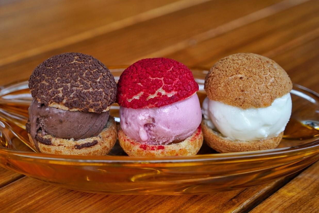 A trio of premium Italian gelato-stuffed profiteroles are served atop a glass candy tray at W Shanghai – The Bund's The Kitchen Table, available on the newly launched summer menu as the Candy Profiterole Ice Cream Sandwich (RMB90).