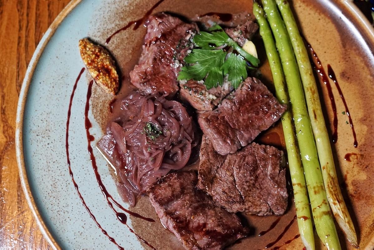 Under whorls of melting butter, the Beef Bavette Wagyu M6 (228RMB) is 180 grams of pure succulence. Known in the US as flank steak, this flat cut of meat is taken from the abdominal muscles of the cow, with very fine intramuscular fat, making it prone to overcooking.