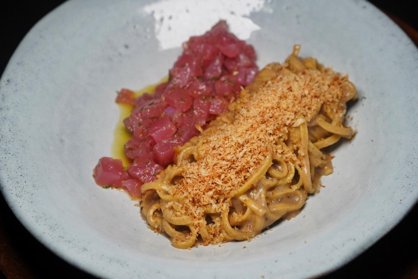 A divisive dish, the Roman-style Butter and Anchovy Pasta (RMB128) is a plate of contrasts – expertly al dente homemade chittara strands slathered in a smarmy butter and anchovy reduction, flanked by juxtaposing refreshingly supple cubes of ginger and dill-marinated tuna tartare.