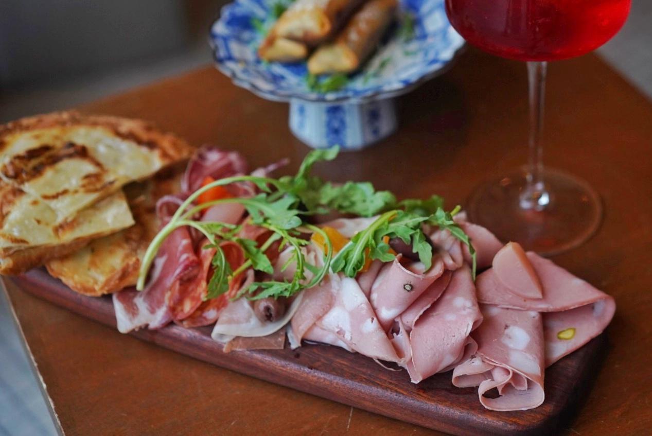 Begin with the Cold Cuts Board (RMB148), Beretta-sourced mortadella, salami, and prosciutto, paired with homemade pickles, olives, and a crispy scallion oil pancake, as opposed to the more conventional bread or biscuit.