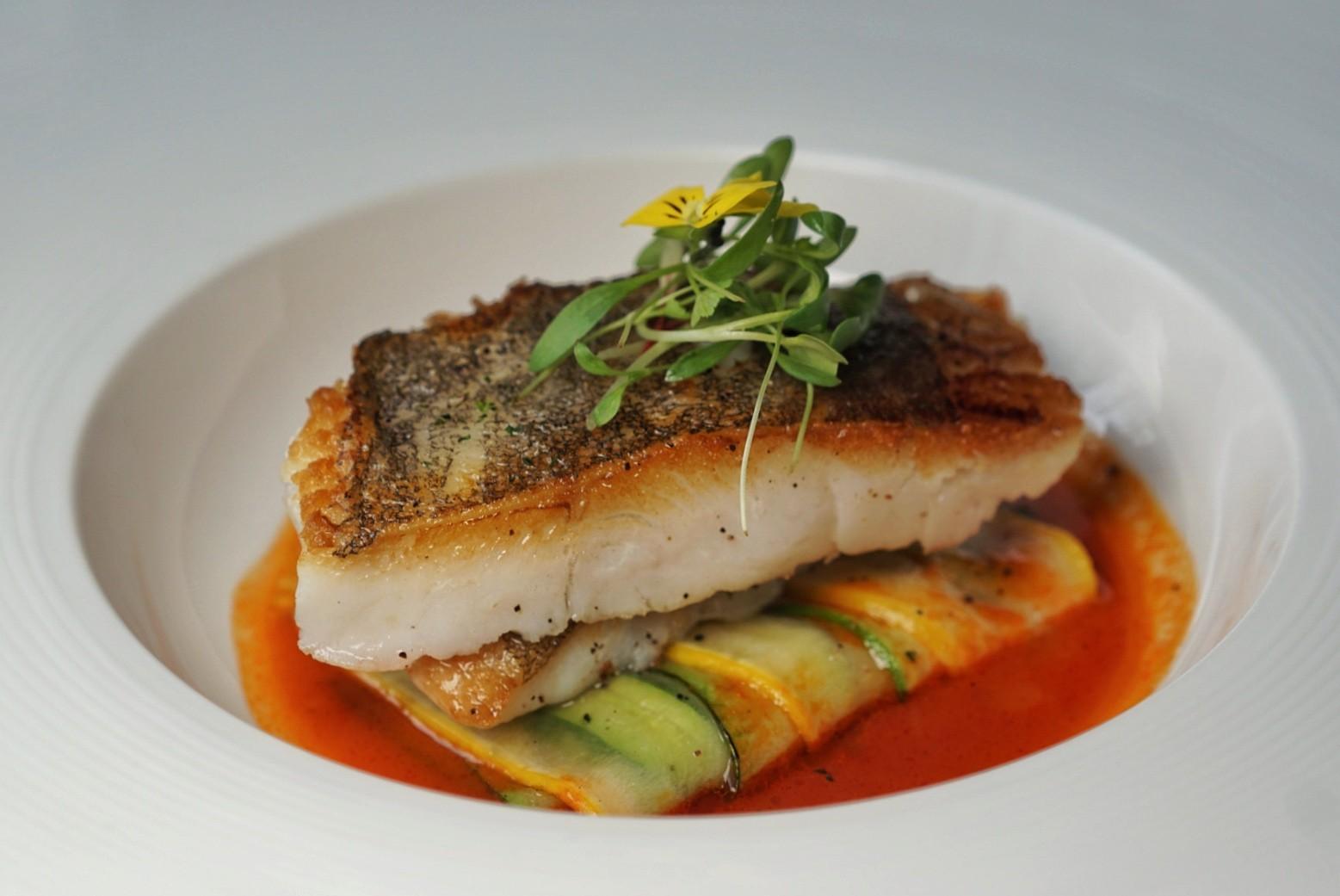 Flaky and tender, the Pan-fried Halibut (RMB168) is seared to reveal ultra-crunchy skin, then stacked on thinly sliced grilled zucchini and yellow squash rounds, swaddled in a creamy red bell pepper sauce.