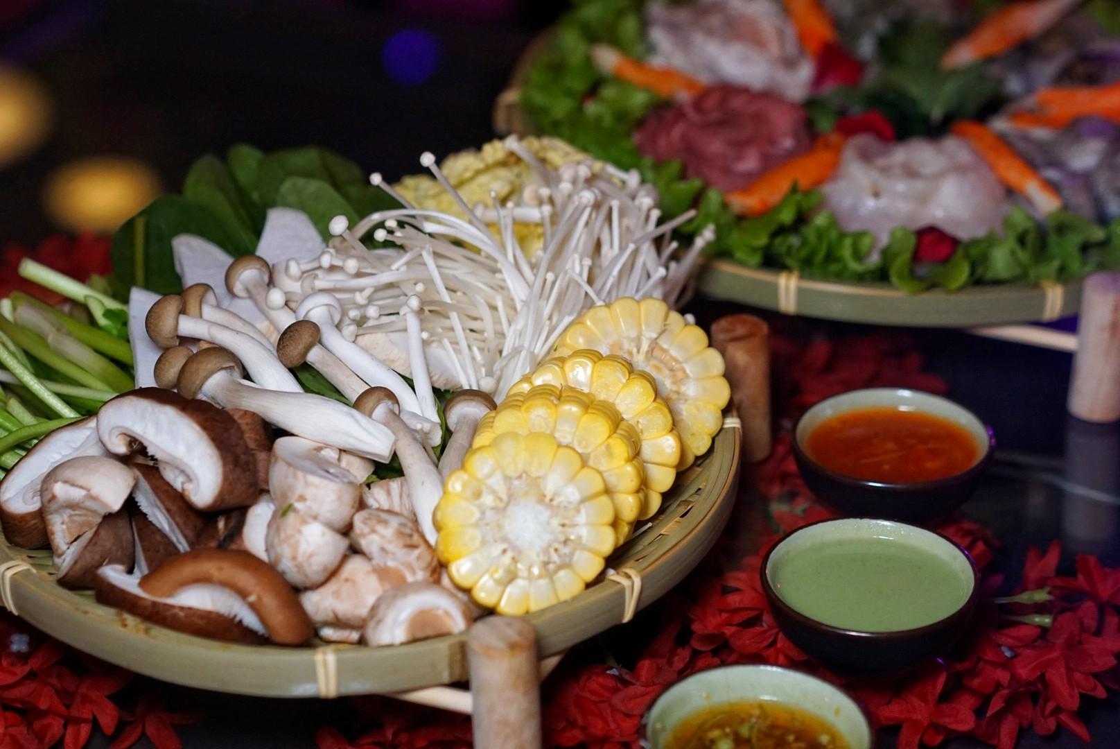 The Vietnamese Beef Hot Pot (RMB188) comprising a meat platter of 150 grams of each of beef slices, pork neck, coconut chicken and beef tongue, plus a mixed vegetable platter, with the Vietnamese beef soup base.