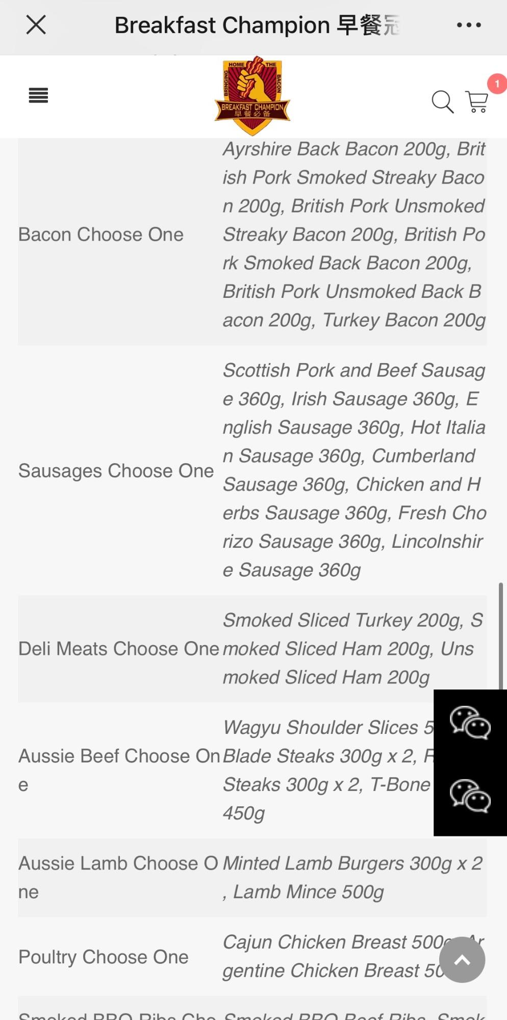 The online store is directly linked to the Breakfast Champion Official WeChat account. Follow their account by scanning the QR code at the end of the article, and enter the store by clicking the Order button. We perused a few items, adding them to our cart with the click of a button and then got really pumped about the Weekly Essentials Choice pack (RMB649), selecting seven items from there from categories like bacon, sausages, deli meats, Aussie beef, Aussie lamb, poultry and smoked BBQ ribs. The set packs offer more of a discount and cover all the basics with expansive selection options in each category.