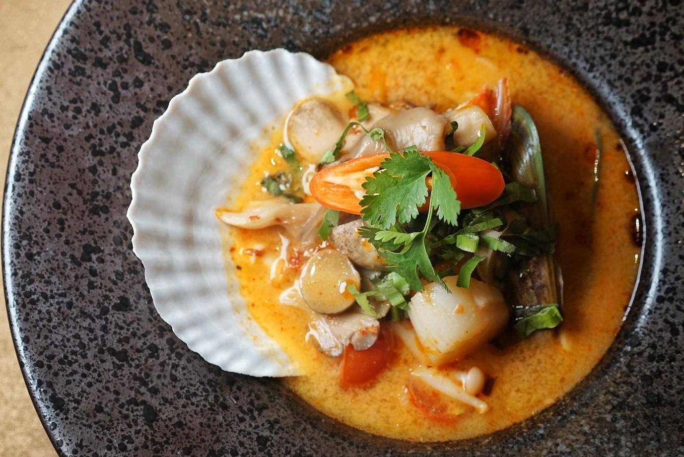 Laden with Japanese scallops, Phuket prawns and New Zealand mussels, the springy mushrooms and soft tomatoes add an additional layer of texture to the already balanced bowl.