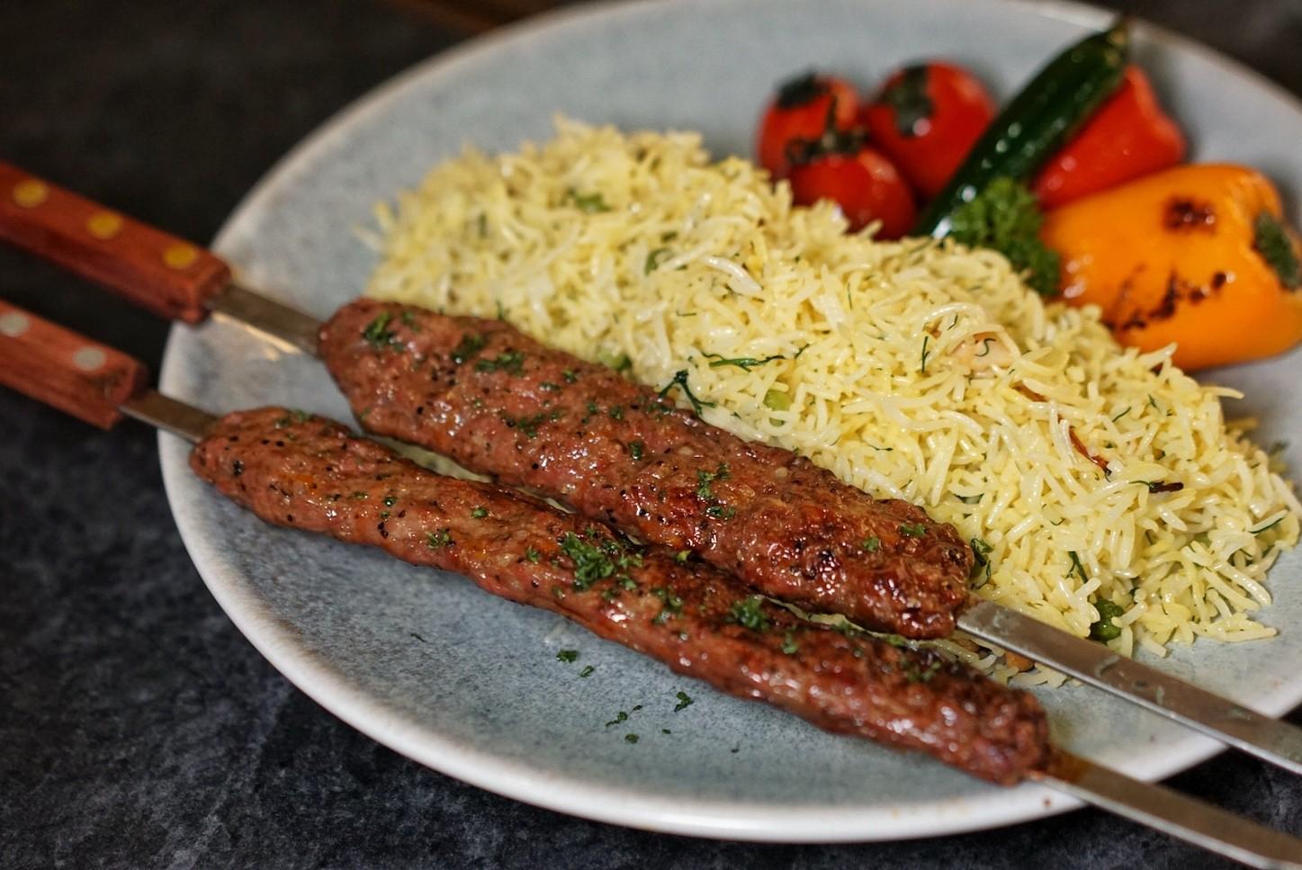Iranian Koobideh (RMB108) – Koobideh kebab, saffron rice studded with roasted cashews, char-grilled tomatoes and bell peppers
