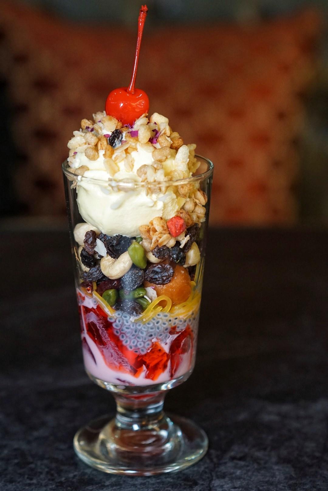 If India taught us anything, it’s that there’s is no dessert more colorful nor more flavorful than their own. This rings true with the Falooda Sundae (RMB78), an American diner twist on the dessert that’s existed in India since the 16th century. Rose milk and jelly layers give way to falooda sev, sweet crisps and dried fruits and nuts. Basil seeds alternate with candied oats, while gulab jamun pearls are sought after like a holy grail. A heaping scoop of vanilla ice cream and a maraschino cherry adorn the top. Other similarly fusion-forward desserts use various rums, like Malibu, or bourbon that are not of Indian origin.