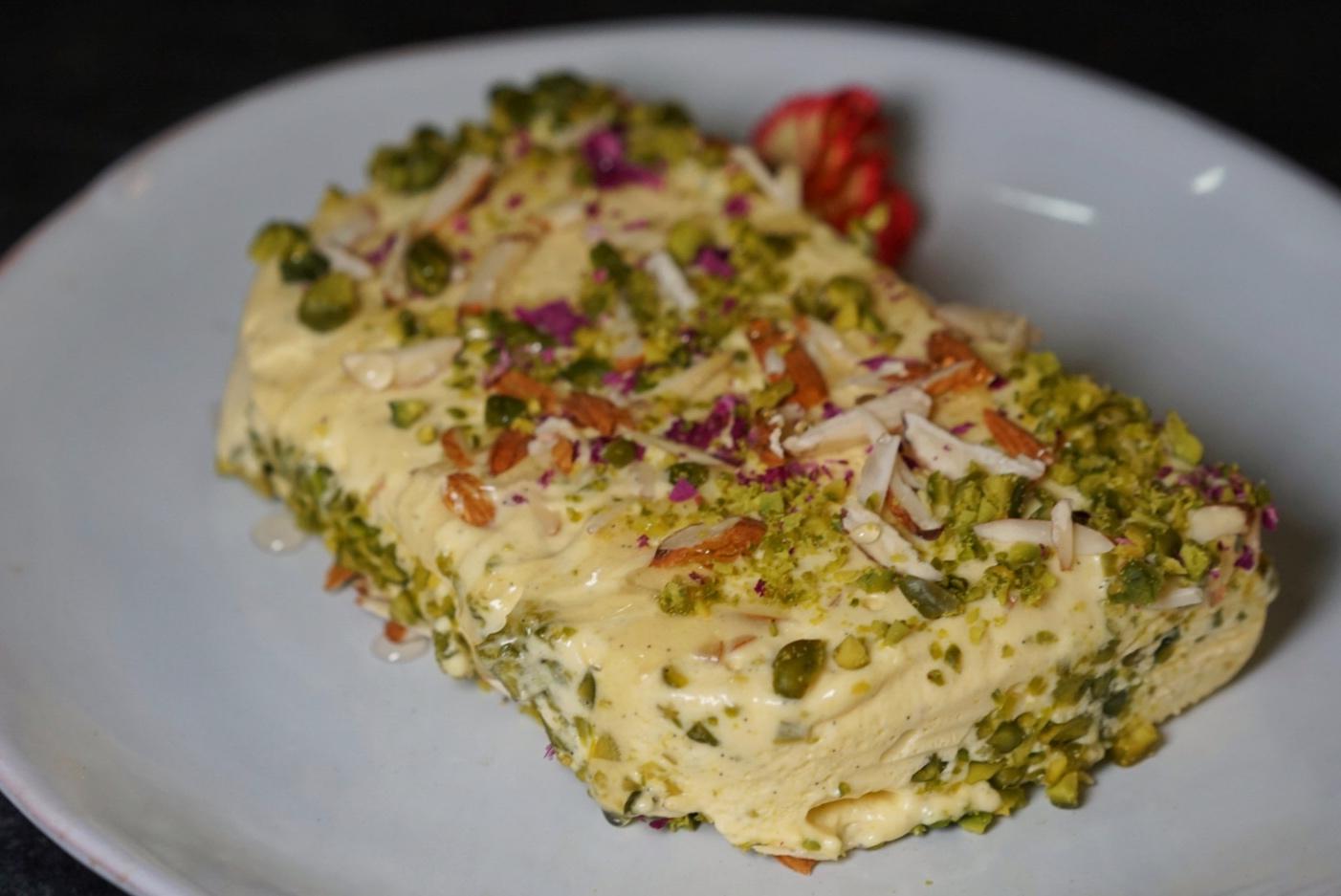 Vanilla Pista & Honey Semifreddo (RMB68) – Vanilla bean paste, cardamom, Iranian pistachios, rose and honey syrup drizzle
