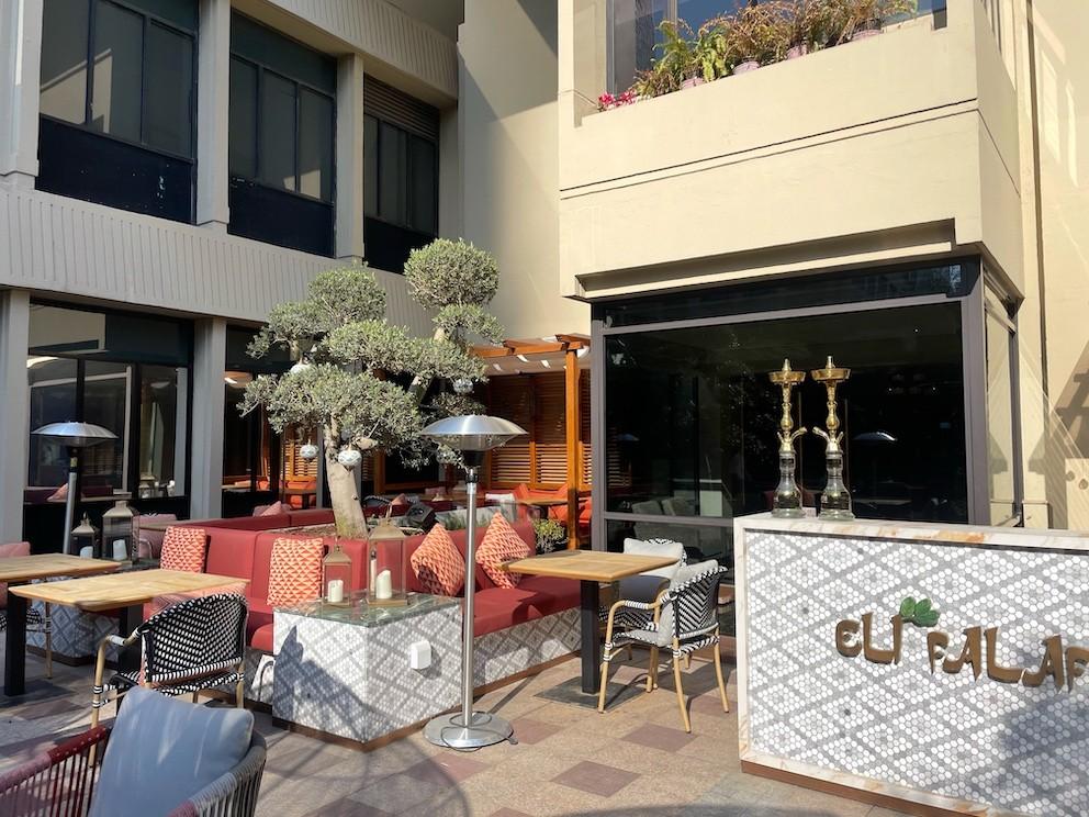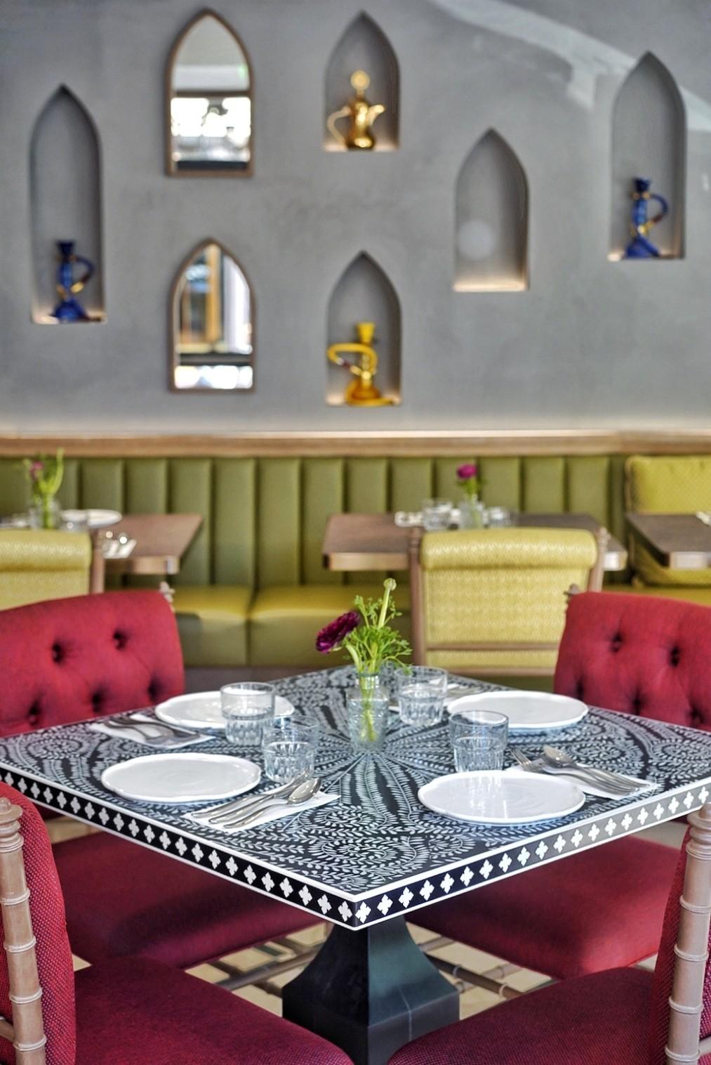 The brightly lit space offers seating for 85 inside and another 70 outside, all outfitted with decorative antique vases, gold-embossed lamps, richly-colored, bead-stitched pillows, and plenty of plants.