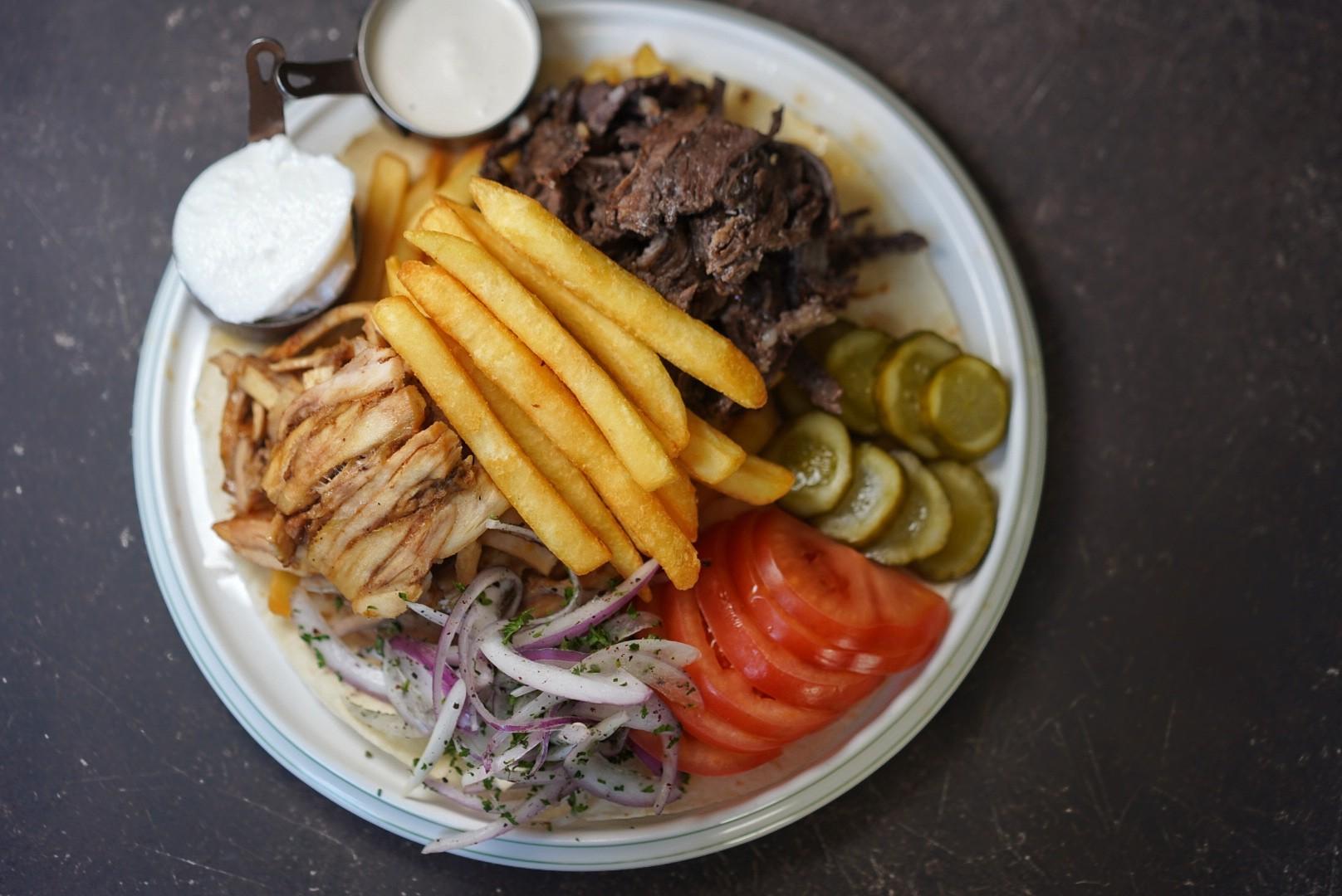 Chicken or beef shawarma with fries, pickles, arugula, tomatoes, herbs and tahini.