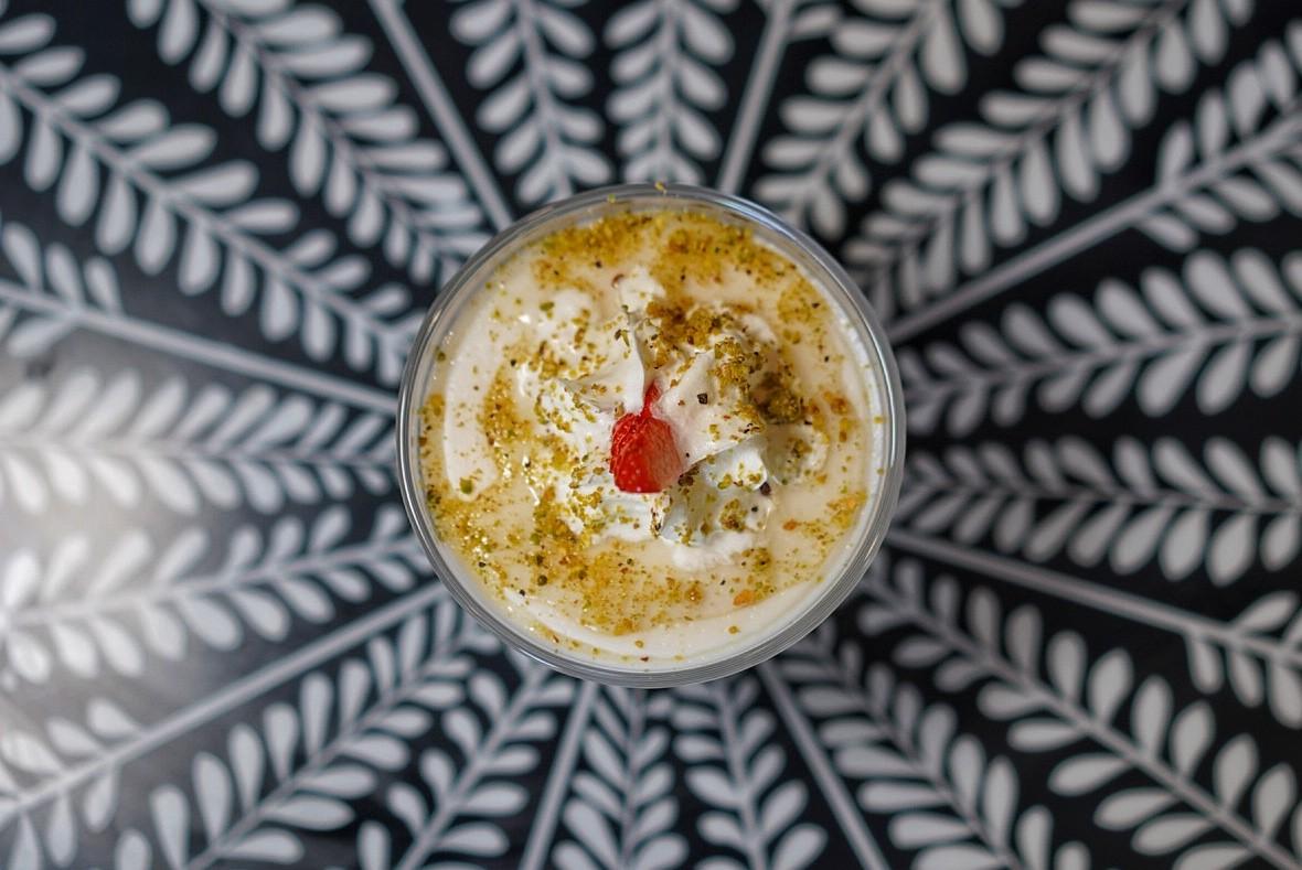 A slurry of milk, corn flour, rose water and sugar forms the base of Ashtalieh (RMB38), a Lebanese pudding with a delicate, flan-like texture, topped with crushed pistachios, a drizzle of syrup and a scoop of mango ice cream.