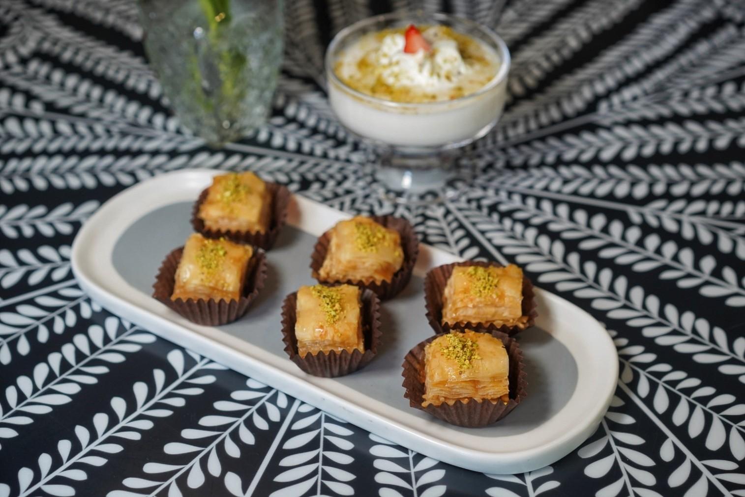 Baked with a golden crust, this tasty Middle Eastern sweet is served hot, dusted with crushed organic pistachios and a lashing of rose water and orange blossom homemade syrup.