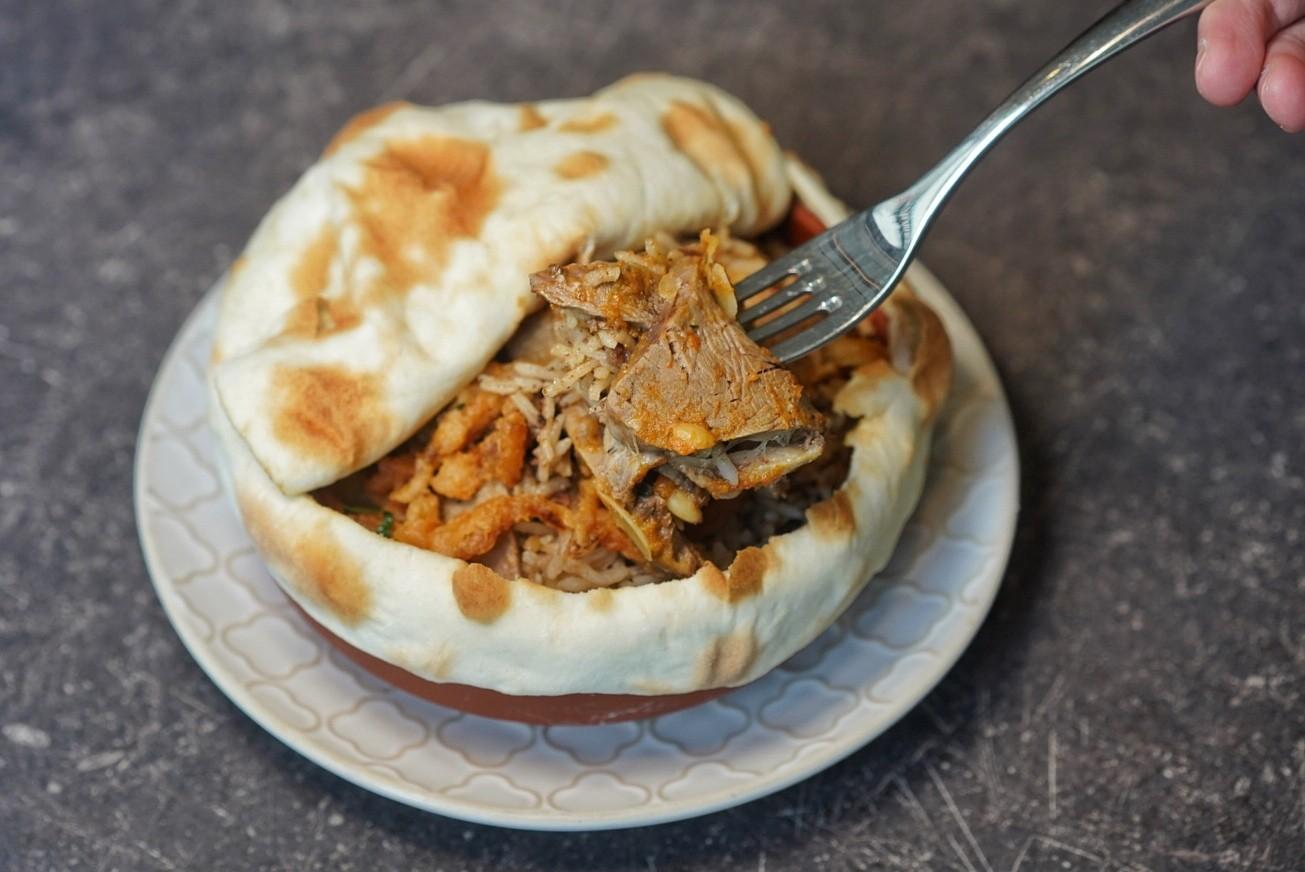 The clay pot is served individually, sheathed by a freshly baked pita bread that is sliced open tableside to reveal the still steaming mixed rice below.
