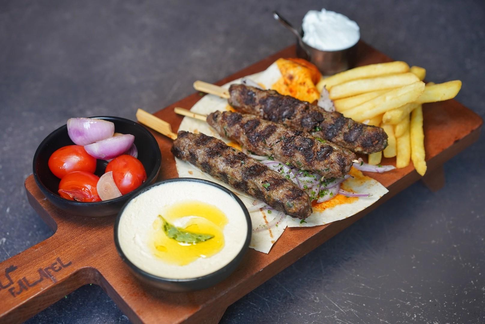 ... to Kafta Kabab (RMB105) – three juicy skewers of spiced minced meat, served with hummus, roasted veggies, fries and pita.