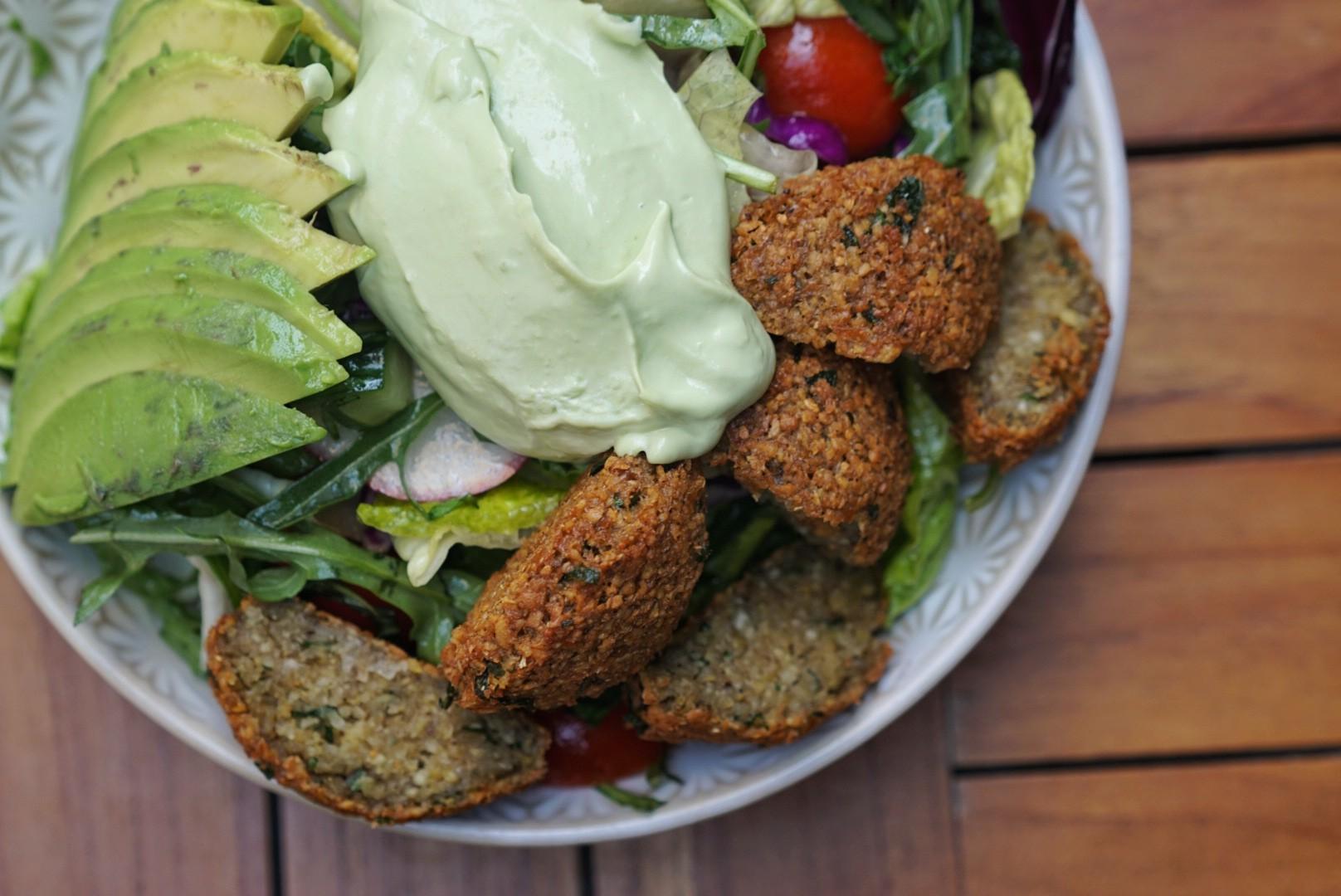 Swapping out the carbs for a bed of fresh lettuce, the salad presents fresh mint leaves and parsley plus tomato and avocado, all drizzled with homemade tahini dressing.