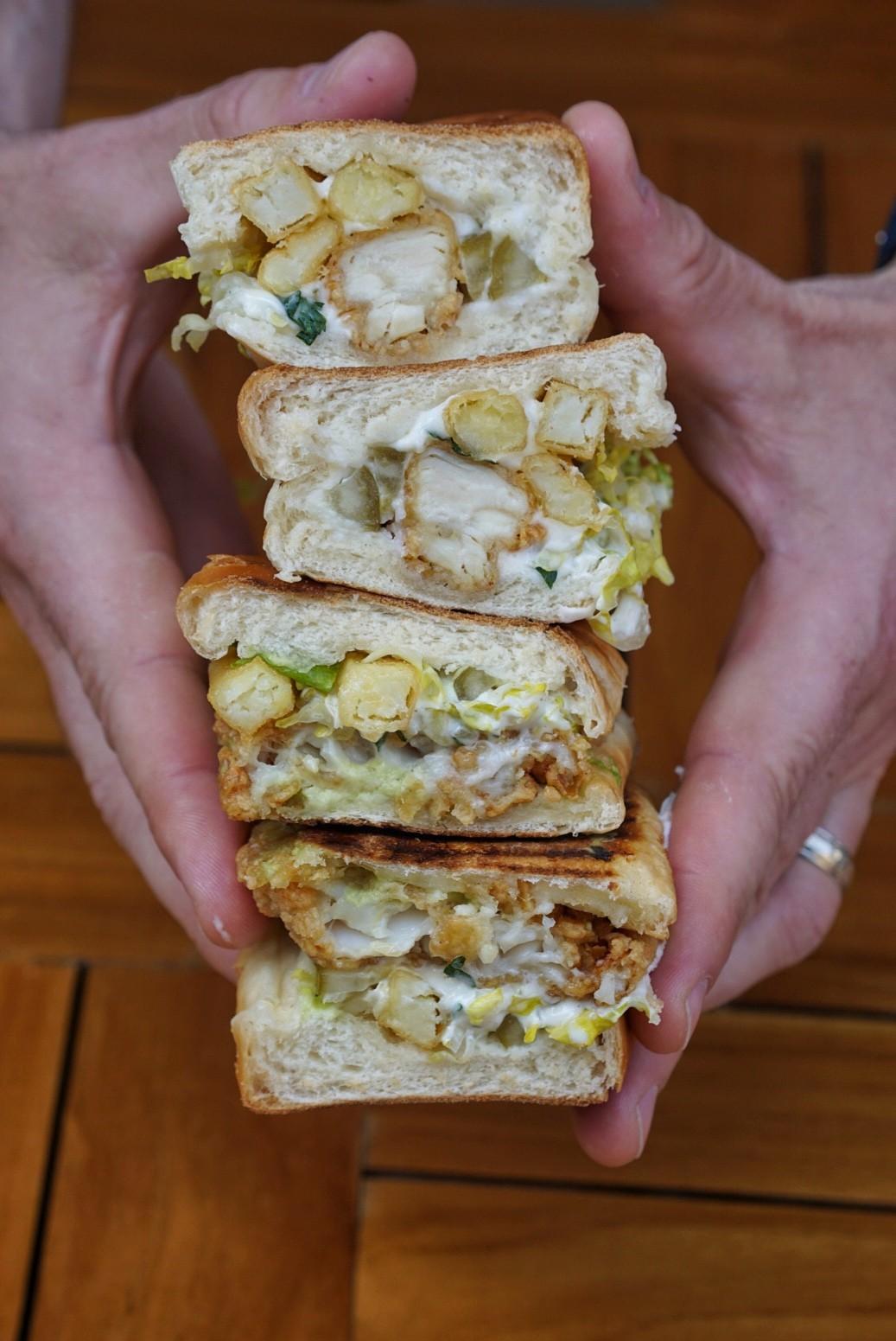 Stacked tall yet structurally sound, each bite results in a satisfying crunch from the batter-fried coating, enhanced by a creamy bite of one of Shanghai’s best coleslaw salads.