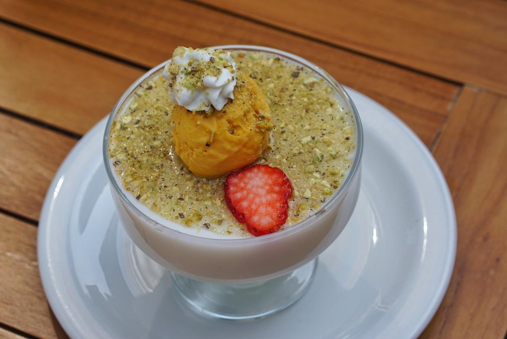 A slurry of milk, corn flour, rose water and sugar forms the base of Ashtalieh (RMB35), a Lebanese pudding with a delicate, flan-like texture, topped with crushed pistachios, a drizzle of syrup and a scoop of mango ice cream.