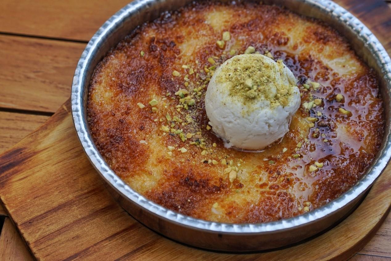 Baked with a golden crust, this tasty Middle Eastern sweet is served hot, dusted with crushed organic pistachios and a lashing of rose water and orange blossom homemade syrup.
