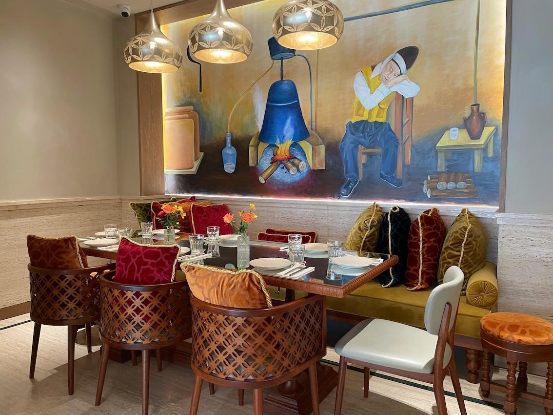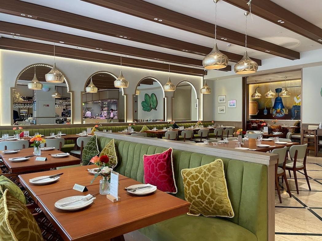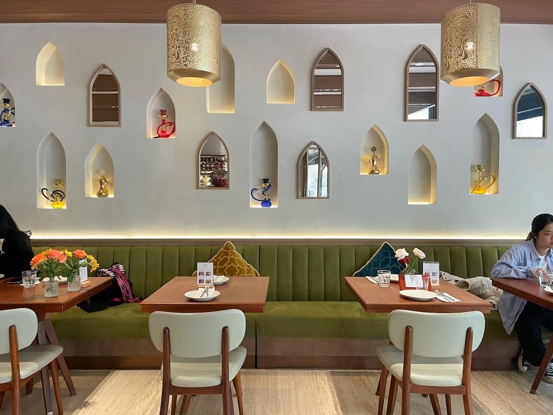 The brightly lit space boasts an open kitchen and a 360-degree bar, with seating for 150 inside and another 80 outside, all outfitted with decorative antique vases, gold-embossed lamps, richly-colored, bead-stitched pillows, while plants abound.