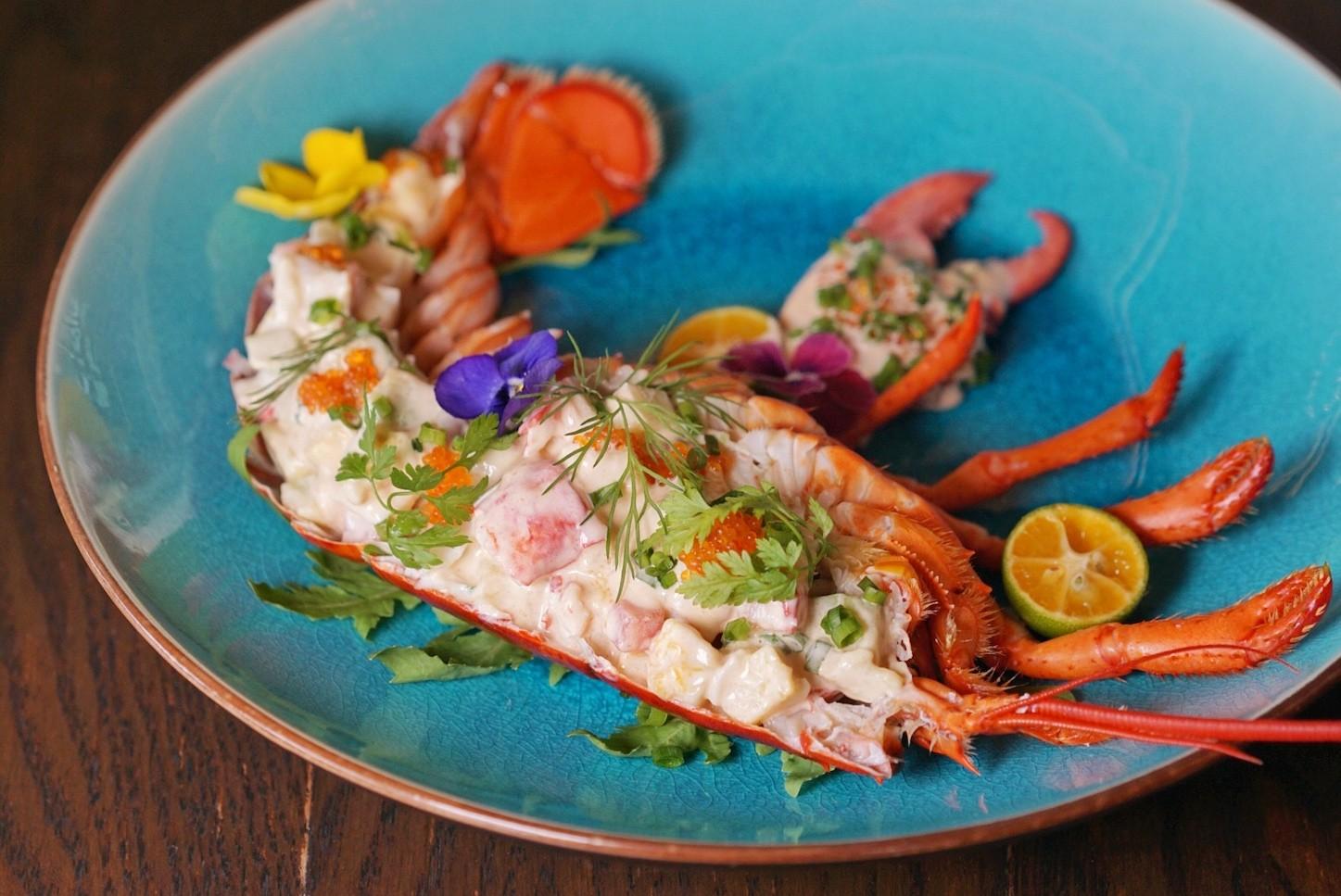 Seasonal fruits, like avocado, tomato and apple are tossed, along with steamed Boston lobster, in a traditionally French style tangy cocktail sauce as the Lobster and Fruits Salad (RMB320). Served inside a lobster half shell, the meat and whole claw are topped with capelin roe beads and fresh herbs.