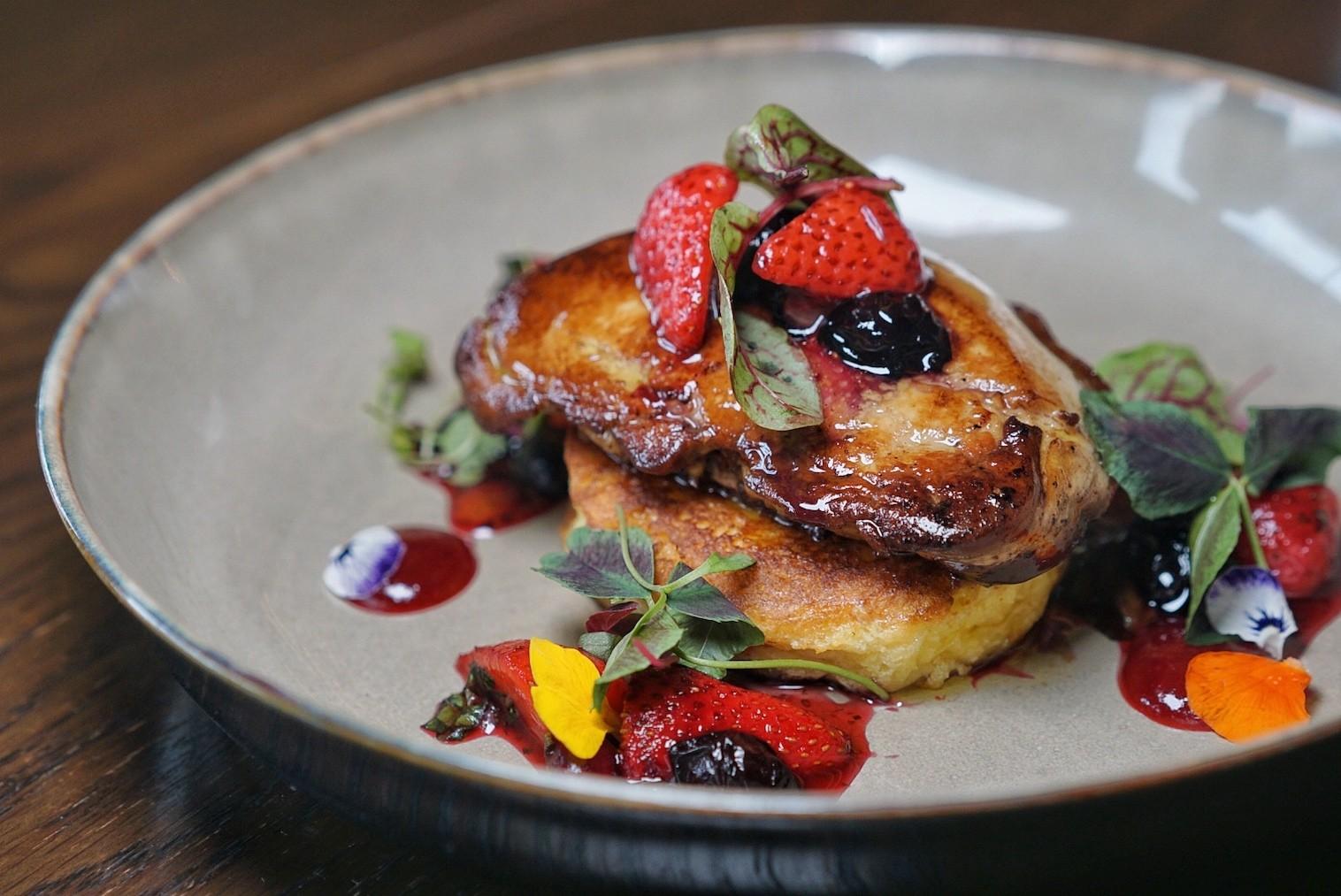 Like the most indulgent form of French toast, the Seared Foie Gras (RMB138) is served atop this brunch favorite, along with pickled red fruits. The mixed berries are first pan-fried then deglazed with raspberry vinegar. A drizzle of tart raspberry coulis helps cut through the buttery foie gras’ fatty richness.