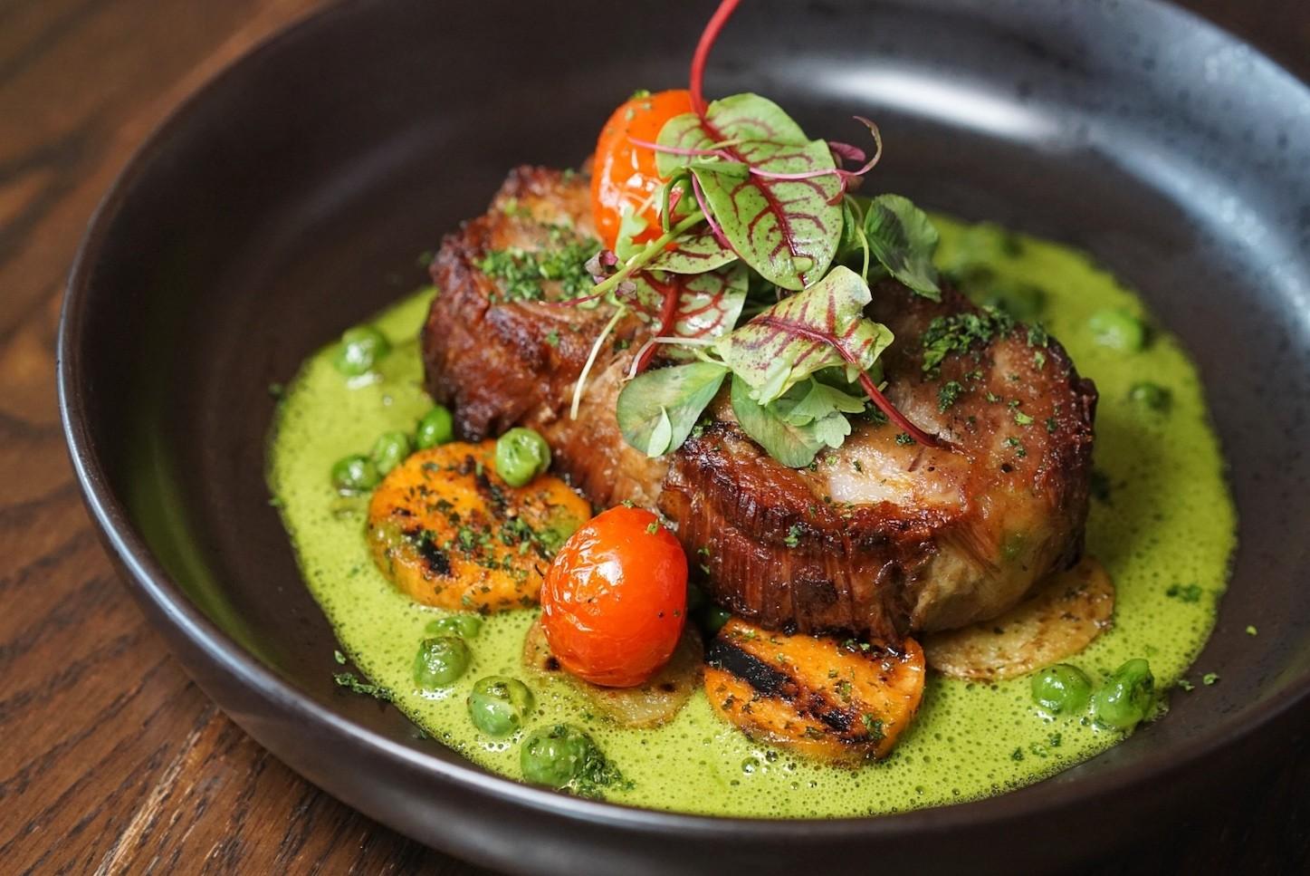 Steamed with an herb infusion of lemongrass, lime leaf, basil, mint, pink peppercorn coriander and loads of citrus, the Nordic Halibut (RMB218) is served with a dribble of lemon verbena oil infusion and a mix of seasonal green vegetables that span bok choy, okra and garden peas.