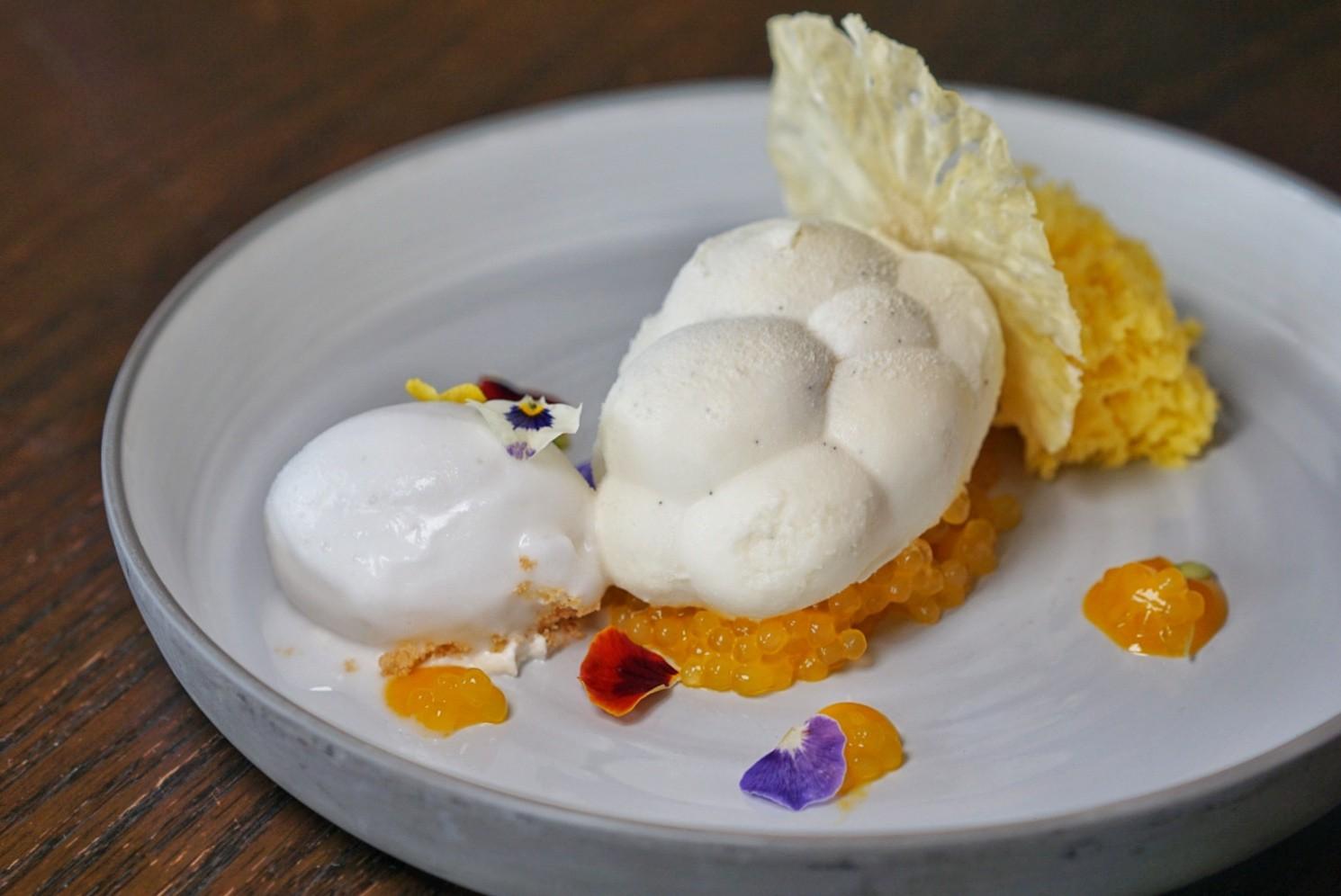 A generous portion of fresh durian is encased in a bulbous-shaped white chocolate coconut mousse as the White Chocolate Durian Cloud Cake (RMB75). Perched atop tapioca pearls cooked in mango and pineapple juice – plus a hit of caramel for extra sweetness – a bite is best enjoyed with Malibu coconut sorbet and mango chiffon cake that simultaneously grace the plate.
