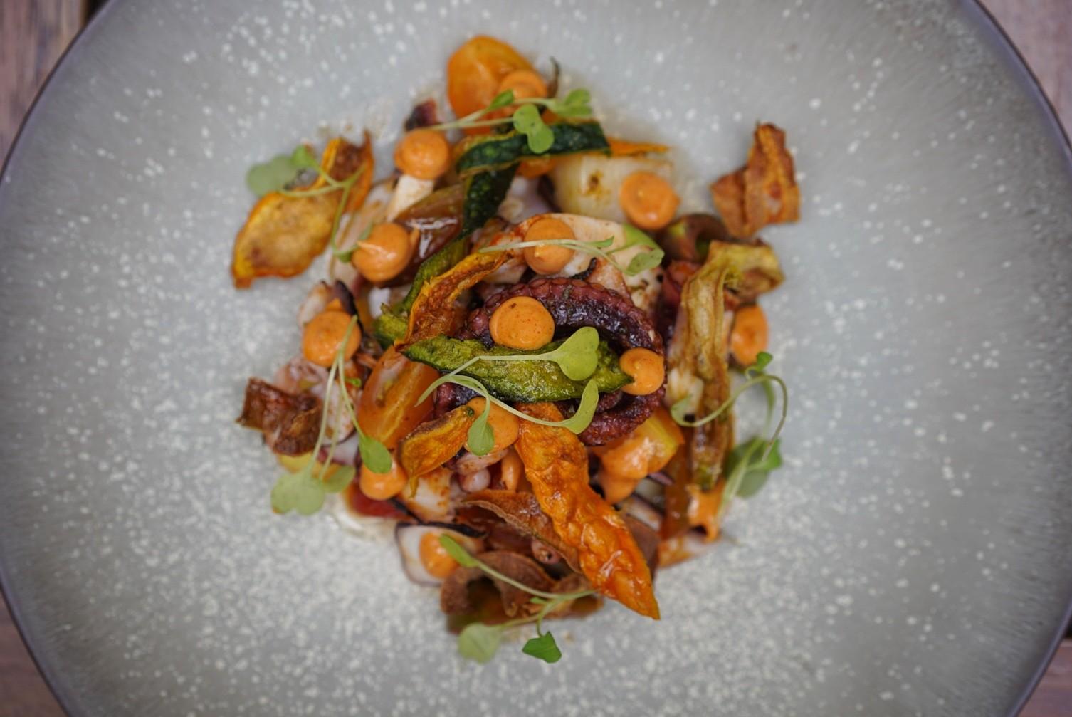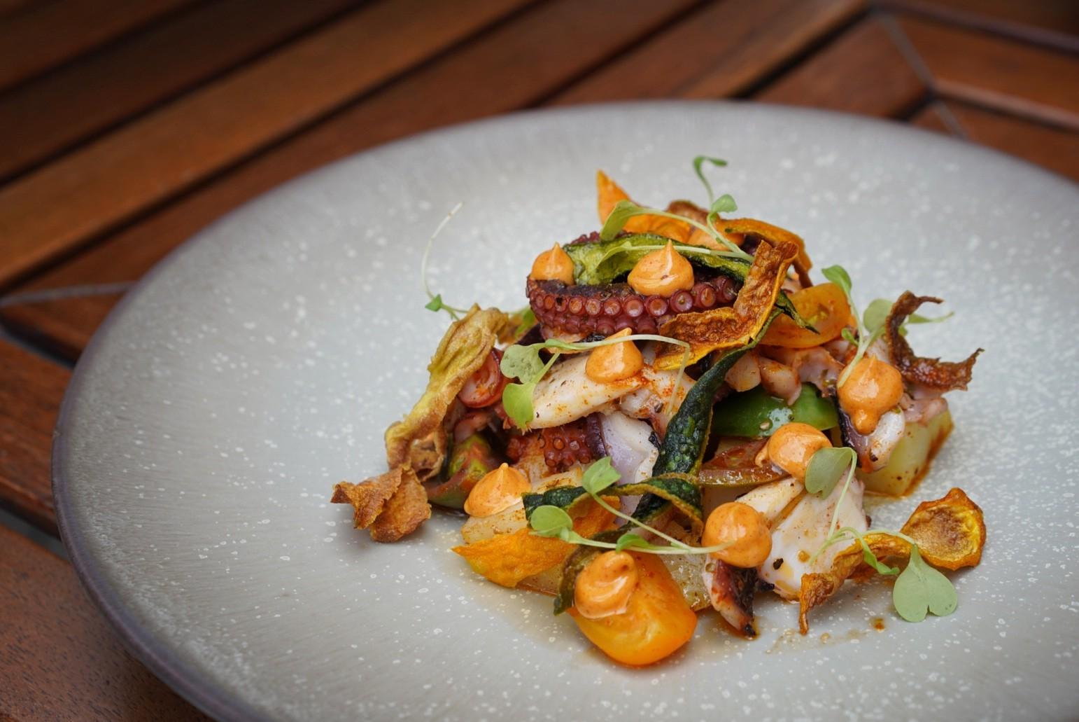 Sous vide Octopus (RMB128) tentacles encircle crispy potatoes, vine-ripened tomatoes and fried squash and zucchini crisps, dotted with zippy paprika aioli and chili oil.