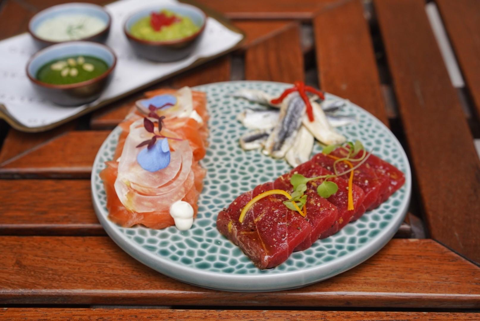 Citrus marinated tuna belly, cured salmon draped in a crisp fennel salad and dollops of sour cream, marinated anchovies and red bell pepper slivers, plus a trio of dipping sauces – basil pesto, Greek tzatziki, and mashed guacamole – make up this refreshingly balanced plate.