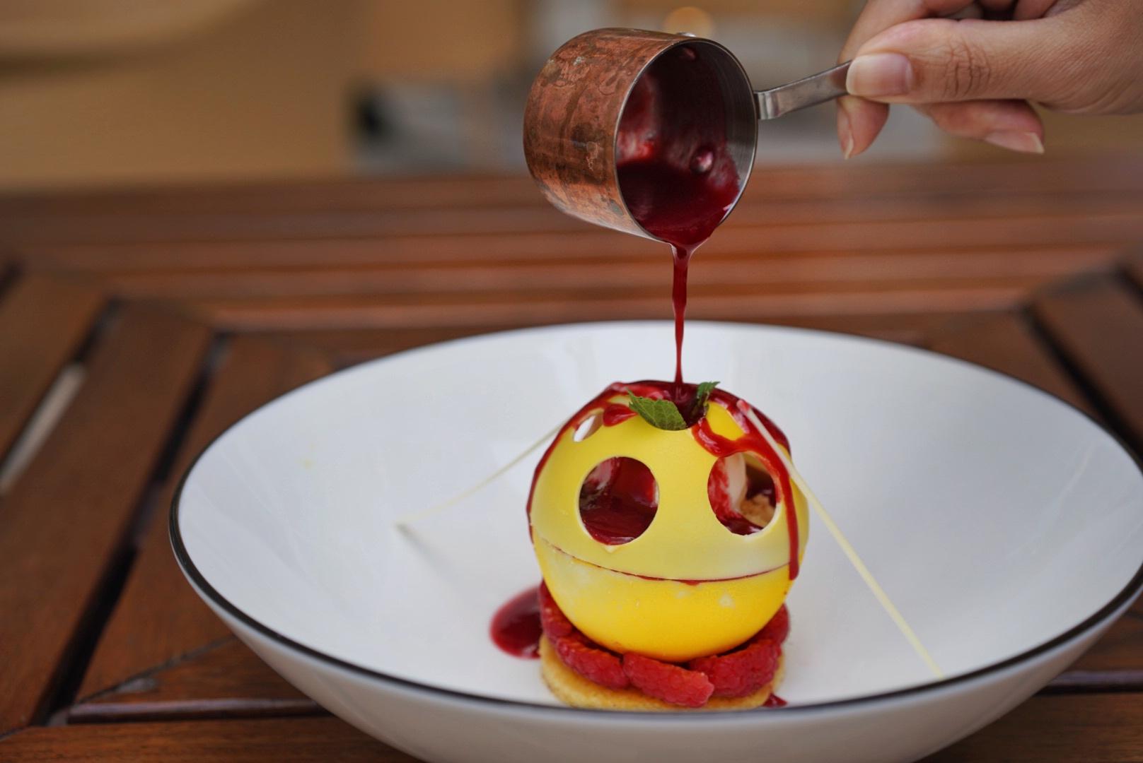 A white chocolate sphere encases Fiori vanilla gelato, lemon mousse and cookie crumble as the Lemon Raspberry Sphere (RMB78).