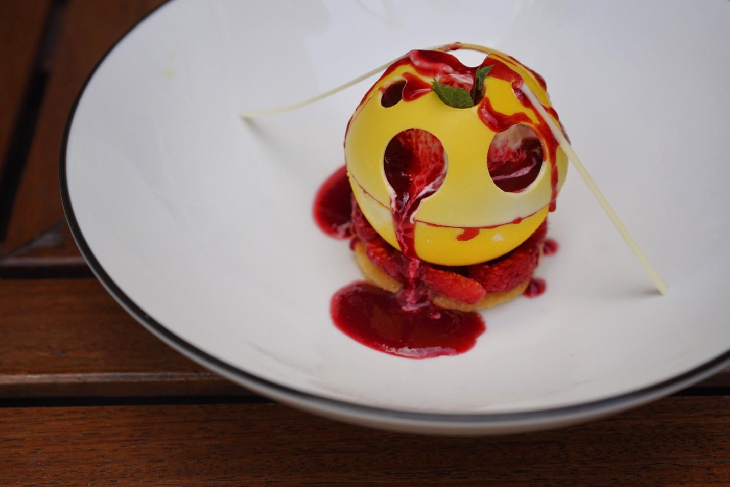 A warm raspberry coulis poured tableside seeps crimson raspberry sauce out of each crevice, pooling in viscous, plasma-like puddles around a shmear of sticky lemon curd holding the sphere in place.