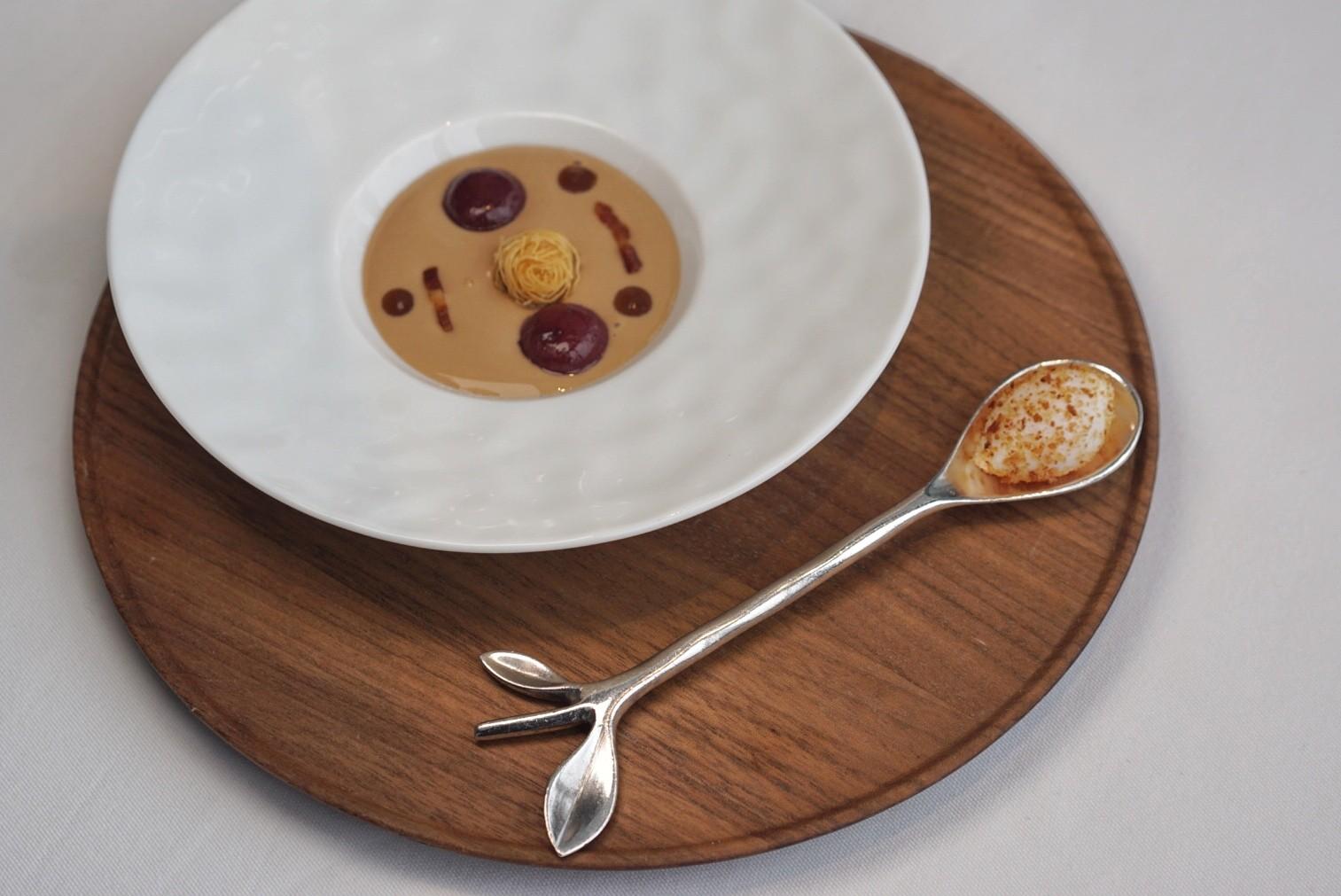 A tribute to the restaurant’s signature dish in Chagny, the Snails & Bamboo is an homage to a traditional Burgundy dish made of snails, garlic and parsley. Soft herb dumplings are stuffed with a potagère of vegetables and snails, flecked with crispy snail and parsley powder.